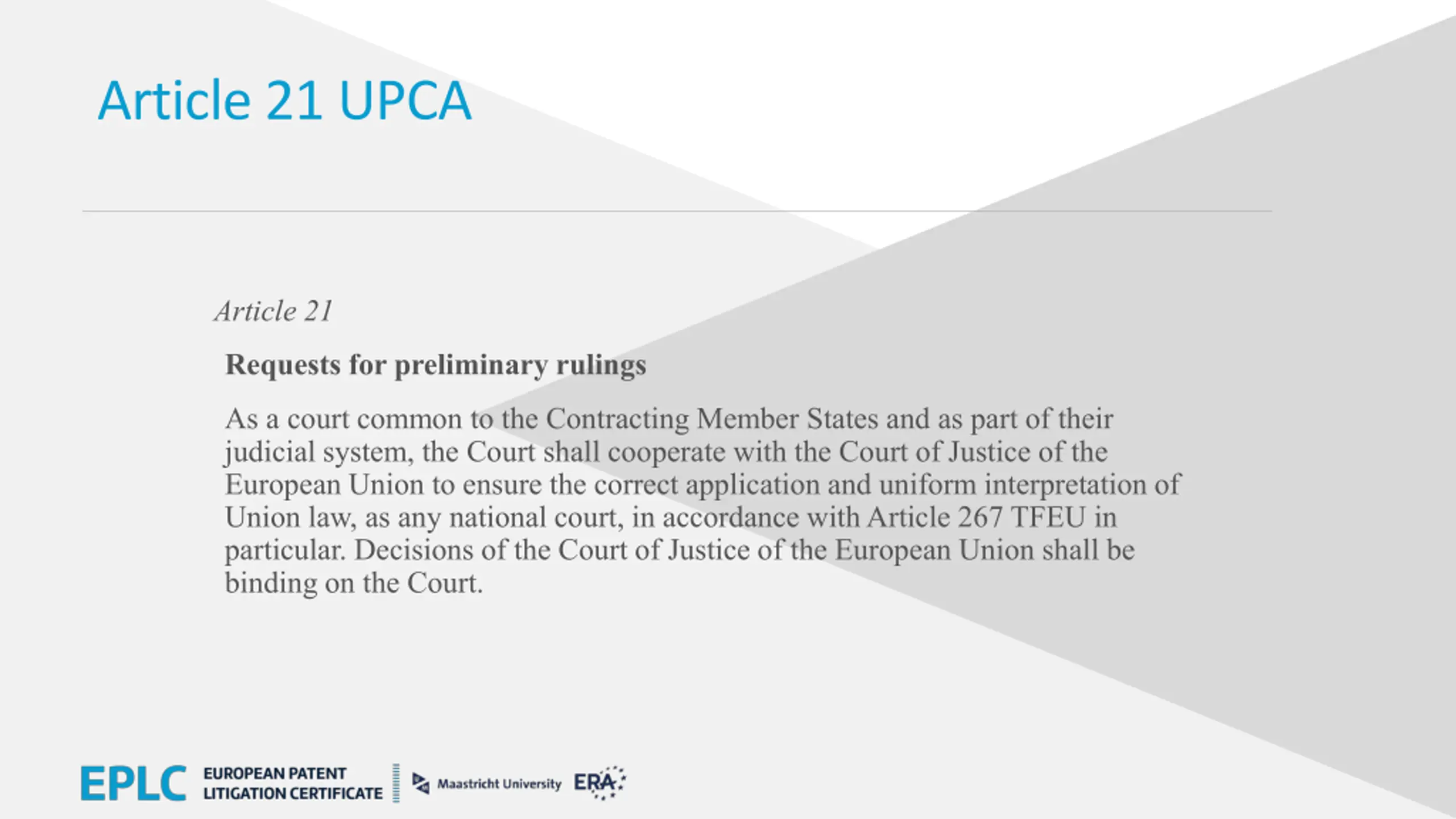 Article 21 UPCA Article 21 Requests for preliminary rulings As a court common to the Contracting Member States and as part of their judicial system, the Court shall cooperate with the Court of Justice of the European Union to ensure the correct application and uniform interpretation of Union law, as any national court, in accordance with Article 267 TFEU in particular. Decisions of the Court of Justice of the European Union shall be binding on the Court.