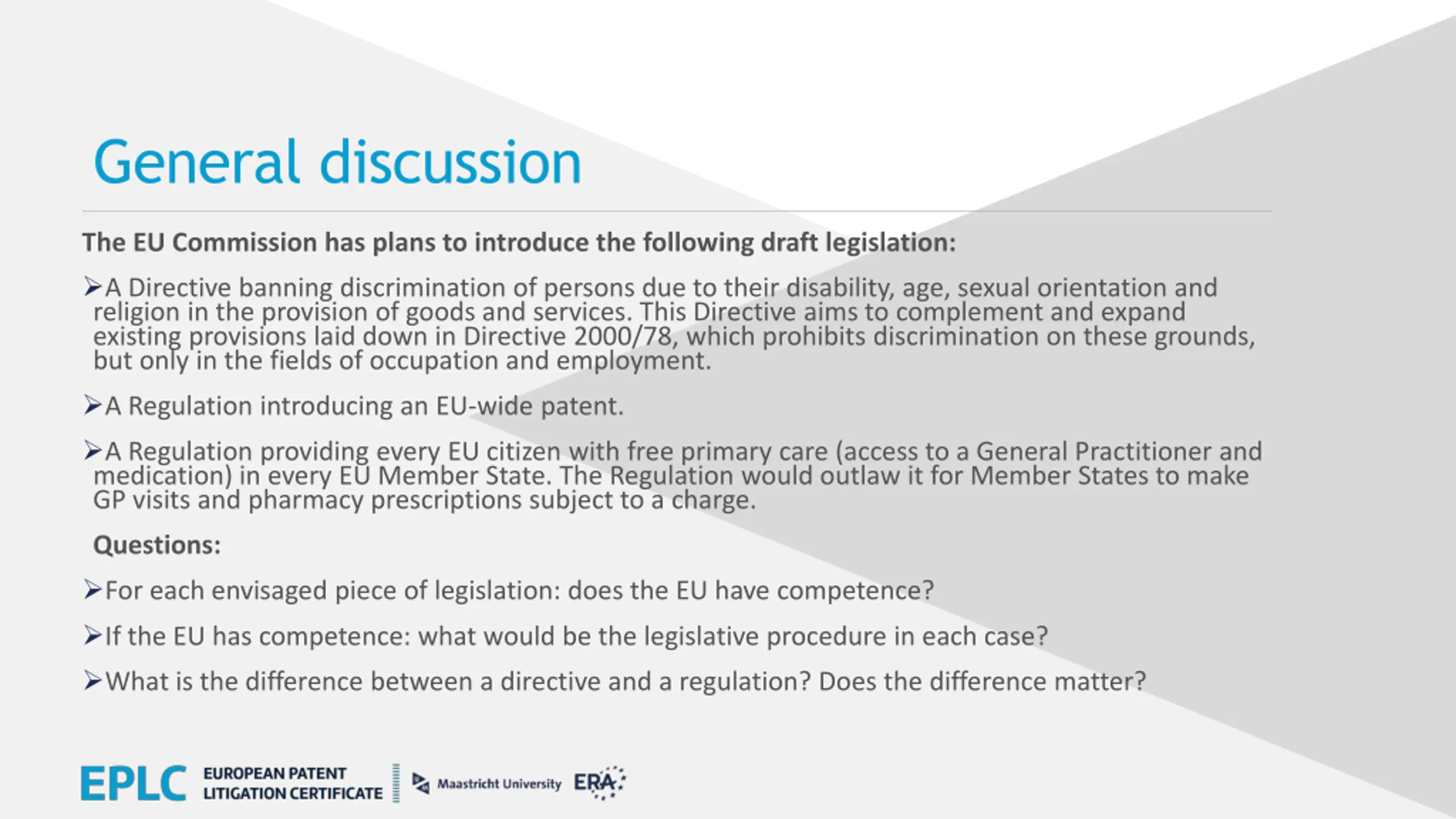 General discussion The EU Commission has plans to introduce the following draft legislation: A Directive banning discrimination of persons due to their disability, age, sexual orientation and religion in the provision of goods and services. This Directive aims to complement and expand existing provisions laid down in Directive 2000/78, which prohibits discrimination on these grounds, but only in the fields of occupation and employment. A Regulation introducing an EU-wide patent. A Regulation providing every EU citizen with free primary care (access to a General Practitioner and medication) in every EU Member State. The Regulation would outlaw it for Member States to make GP visits and pharmacy prescriptions subject to a charge. Questions: For each envisaged piece of legislation: does the EU have competence? If the EU has competence: what would be the legislative procedure in each case? What is the difference between a directive and a regulation? Does the difference matter?