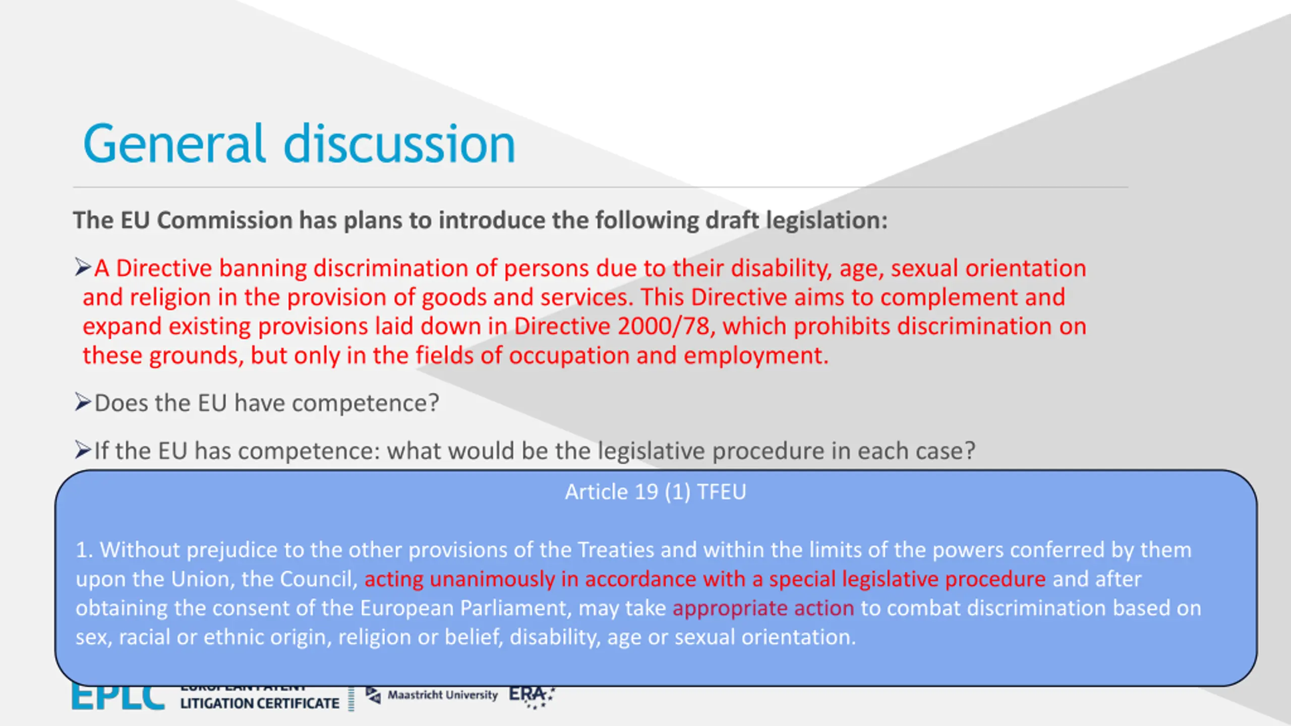General discussion The EU Commission has plans to introduce the following draft legislation: A Directive banning discrimination of persons due to their disability, age, sexual orientation and religion in the provision of goods and services. This Directive aims to complement and expand existing provisions laid down in Directive 2000/78, which prohibits discrimination on these grounds, but only in the fields of occupation and employment. Does the EU have competence? If the EU has competence: what would be the legislative procedure in each case? What is the difference between a directive and a regulation? Does the difference matter? Article 19 (1) TFEU 1. Without prejudice to the other provisions of the Treaties and within the limits of the powers conferred by them upon the Union, the Council, acting unanimously in accordance with a special legislative procedure and after obtaining the consent of the European Parliament, may take appropriate action to combat discrimination based on sex, racial or ethnic origin, religion or belief, disability, age or sexual orientation.