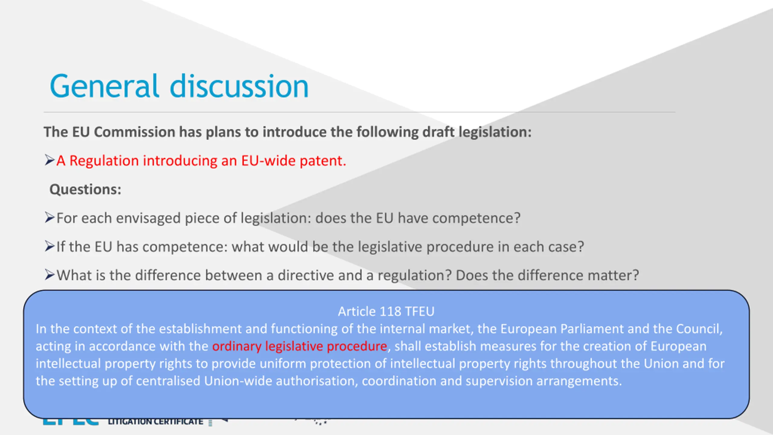 General discussion The EU Commission has plans to introduce the following draft legislation: A Regulation introducing an EU-wide patent. Questions: For each envisaged piece of legislation: does the EU have competence? If the EU has competence: what would be the legislative procedure in each case? What is the difference between a directive and a regulation? Does the difference matter? Article 118 TFEU In the context of the establishment and functioning of the internal market, the European Parliament and the Council, acting in accordance with the ordinary legislative procedure, shall establish measures for the creation of European intellectual property rights to provide uniform protection of intellectual property rights throughout the Union and for the setting up of centralised Union-wide authorisation, coordination and supervision arrangements.