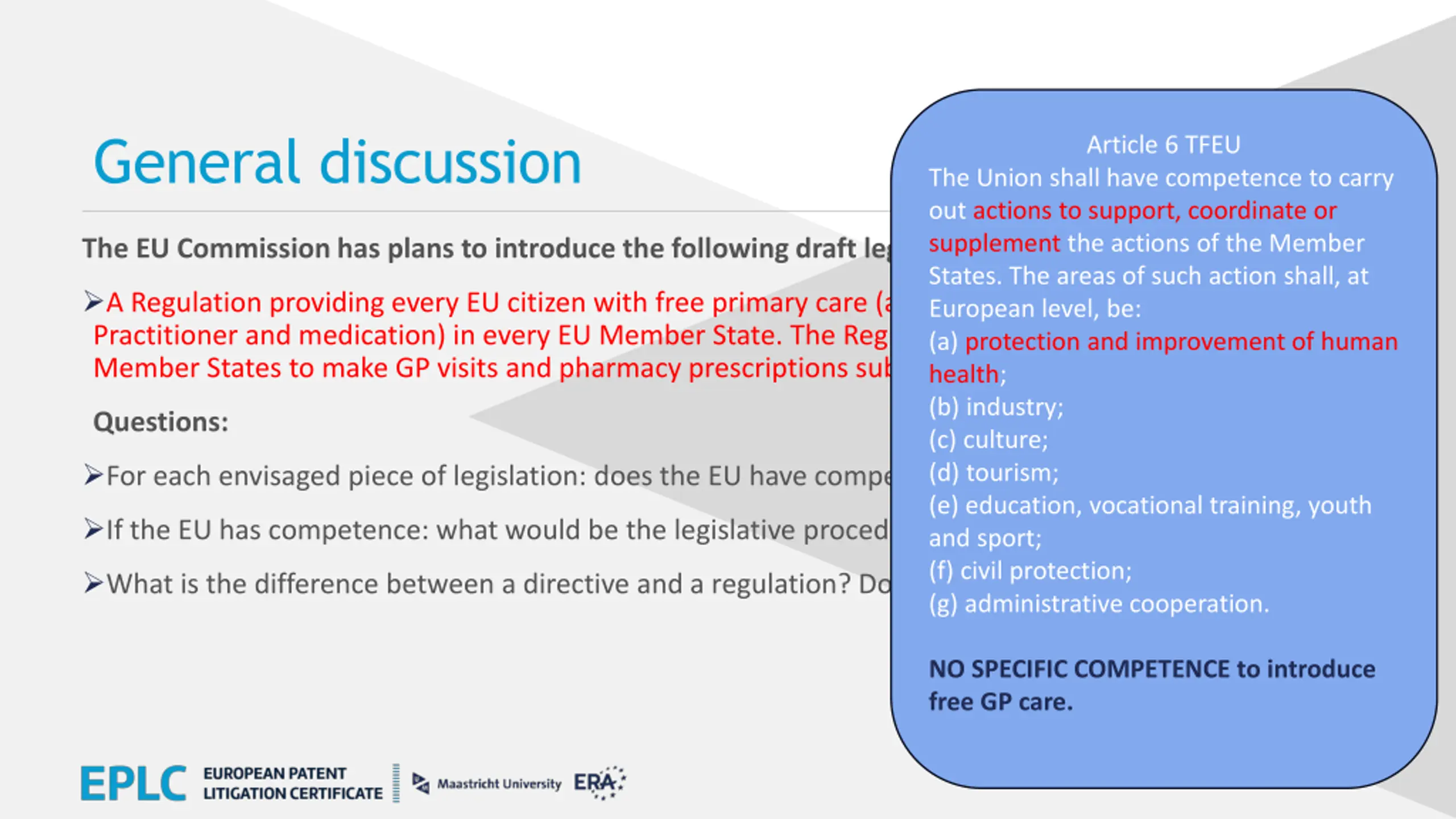 General discussion Article 6 TFEU The Union shall have competence to carry out actions to support, coordinate or supplement the actions of the Member States. The areas of such action shall, at European level, be: (a) protection and improvement of human health; (b) industry; (c) culture; (d) tourism; (e) education, vocational training, youth and sport; (f) civil protection; (g) administrative cooperation. The EU Commission has plans to introduce the following draft legislation: A Regulation providing every EU citizen with free primary care (access to a General Practitioner and medication) in every EU Member State. The Regulation would outlaw it for Member States to make GP visits and pharmacy prescriptions subject to a charge. Questions: For each envisaged piece of legislation: does the EU have competence? If the EU has competence: what would be the legislative procedure in each case? What is the difference between a directive and a regulation? Does the difference matter? NO SPECIFIC COMPETENCE to introduce free GP care.
