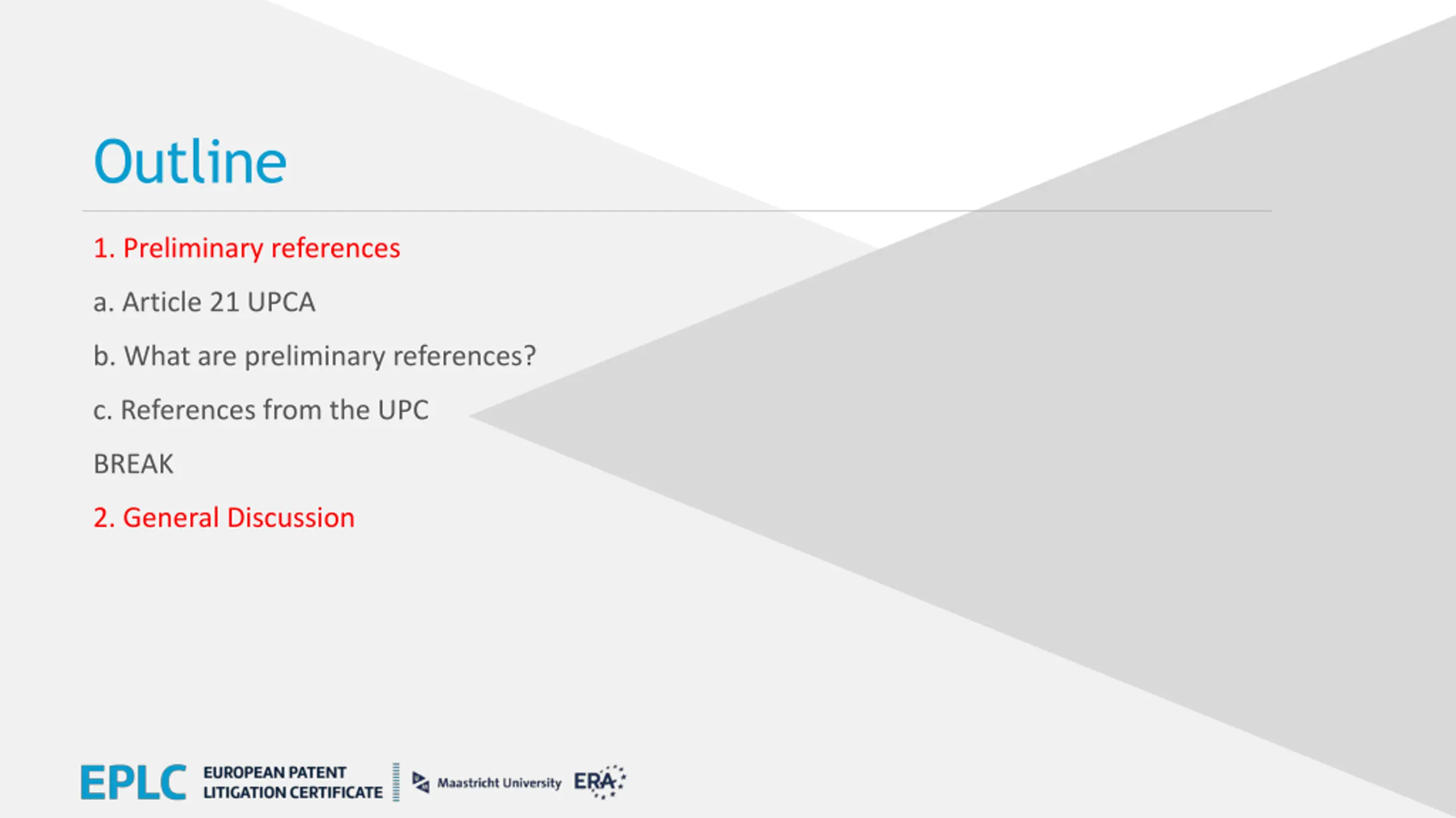 Outline 1. Preliminary references a. Article 21 UPCA b. What are preliminary references? c. References from the UPC BREAK 2. General Discussion