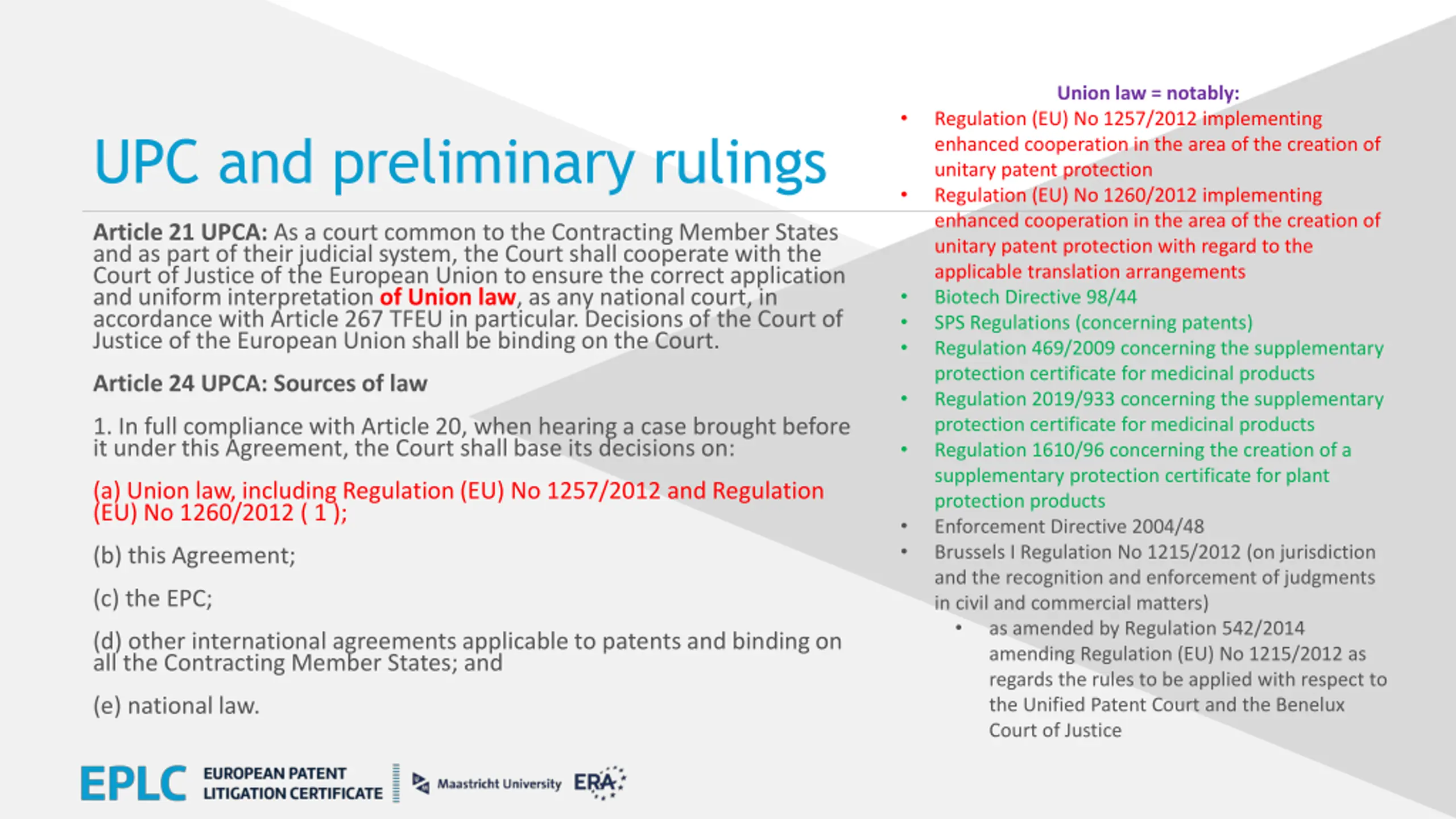 Union law = notably: Regulation (EU) No 1257/2012 implementing enhanced cooperation in the area of the creation of unitary patent protection Regulation (EU) No 1260/2012 implementing enhanced cooperation in the area of the creation of unitary patent protection with regard to the applicable translation arrangements Biotech Directive 98/44 SPS Regulations (concerning patents) Regulation 469/2009 concerning the supplementary protection certificate for medicinal products Regulation 2019/933 concerning the supplementary protection certificate for medicinal products Regulation 1610/96 concerning the creation of a supplementary protection certificate for plant protection products Enforcement Directive 2004/48 Brussels I Regulation No 1215/2012 (on jurisdiction and the recognition and enforcement of judgments in civil and commercial matters) as amended by Regulation 542/2014 amending Regulation (EU) No 1215/2012 as regards the rules to be applied with respect to the Unified Patent Court and the Benelux Court of Justice UPC and preliminary rulings Article 21 UPCA: As a court common to the Contracting Member States and as part of their judicial system, the Court shall cooperate with the Court of Justice of the European Union to ensure the correct application and uniform interpretation of Union law, as any national court, in accordance with Article 267 TFEU in particular. Decisions of the Court of Justice of the European Union shall be binding on the Court. Article 24 UPCA: Sources of law 1. In full compliance with Article 20, when hearing a case brought before it under this Agreement, the Court shall base its decisions on: (a) Union law, including Regulation (EU) No 1257/2012 and Regulation (EU) No 1260/2012 ( 1 ); (b) this Agreement; (c) the EPC; (d) other international agreements applicable to patents and binding on all the Contracting Member States; and (e) national law.