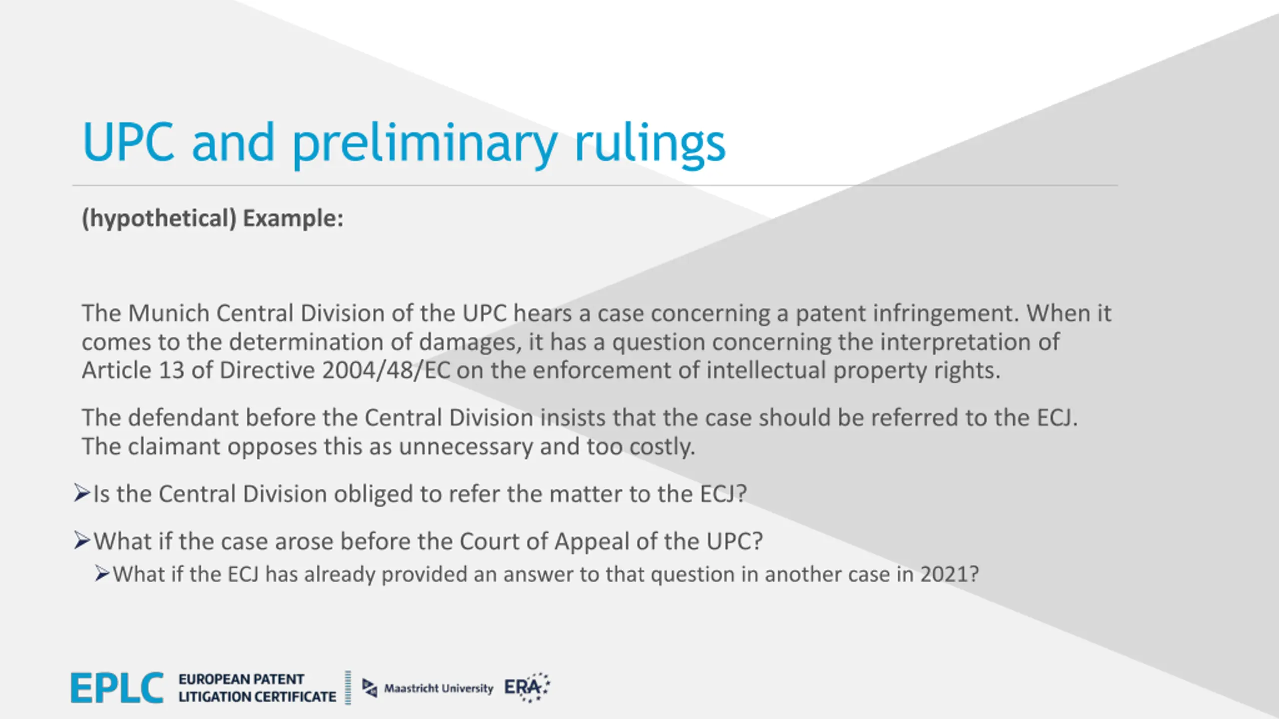 UPC and preliminary rulings (hypothetical) Example: The Munich Central Division of the UPC hears a case concerning a patent infringement. When it comes to the determination of damages, it has a question concerning the interpretation of Article 13 of Directive 2004/48/EC on the enforcement of intellectual property rights. The defendant before the Central Division insists that the case should be referred to the ECJ. The claimant opposes this as unnecessary and too costly. Is the Central Division obliged to refer the matter to the ECJ? What if the case arose before the Court of Appeal of the UPC? What if the ECJ has already provided an answer to that question in another case in 2021?