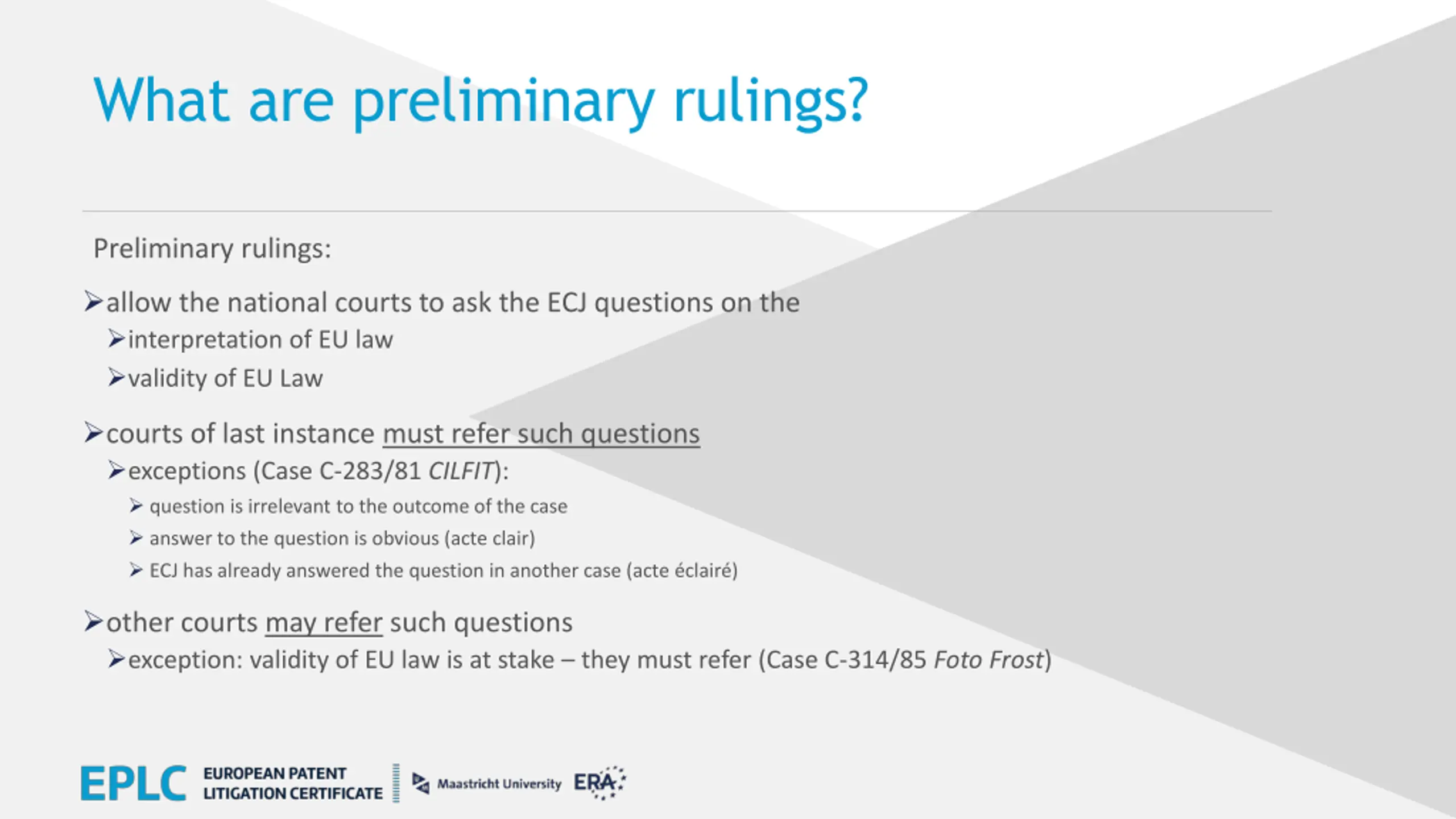 What are preliminary rulings? Preliminary rulings: allow the national courts to ask the ECJ questions on the interpretation of EU law validity of EU Law courts of last instance must refer such questions exceptions (Case C-283/81 CILFIT): question is irrelevant to the outcome of the case answer to the question is obvious (acte clair) ECJ has already answered the question in another case (acte clair ) other courts may refer such questions exception: validity of EU law is at stake they must refer (Case C-314/85 Foto Frost)