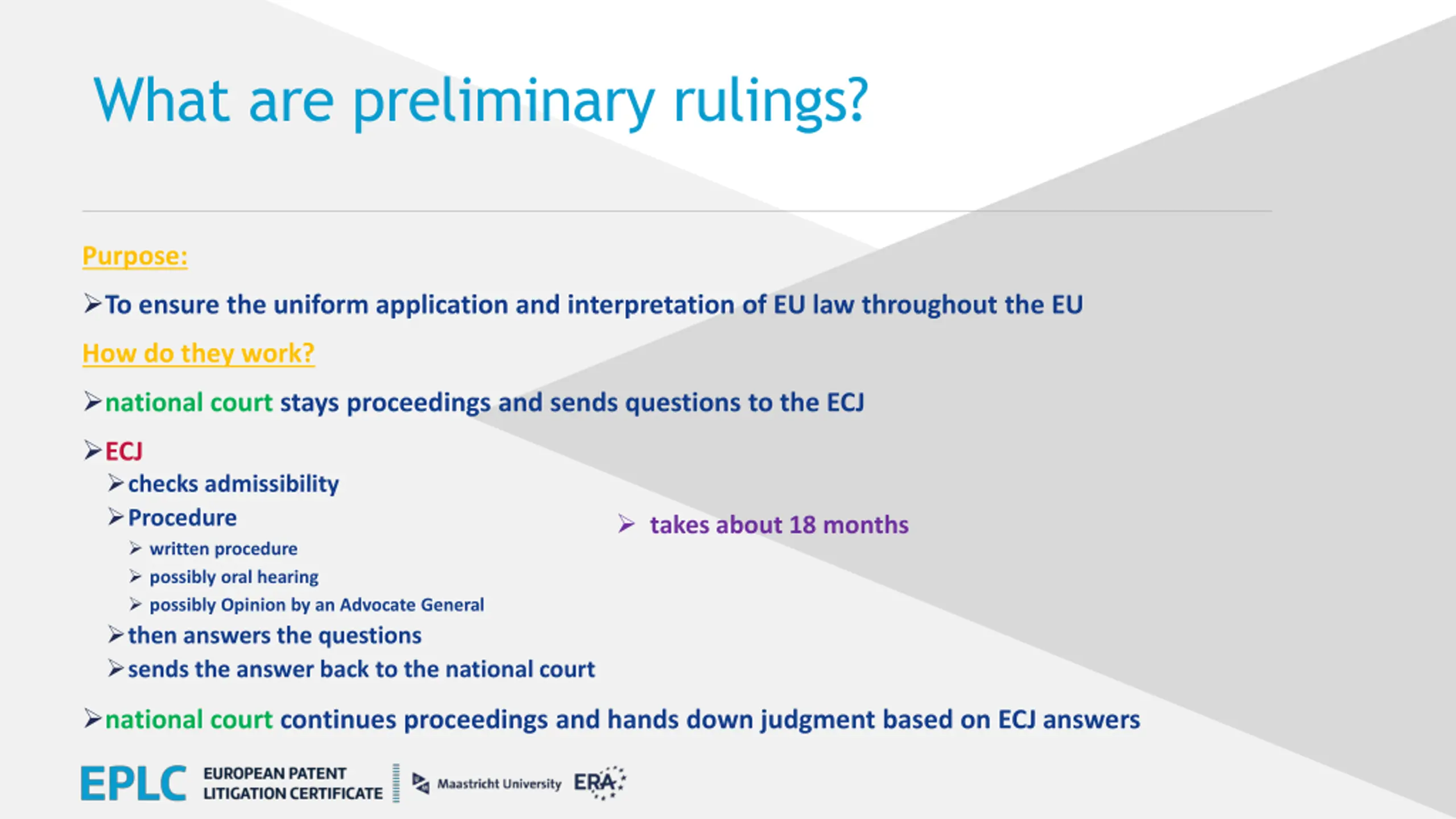 What are preliminary rulings? Purpose: To ensure the uniform application and interpretation of EU law throughout the EU How do they work? national court stays proceedings and sends questions to the ECJ ECJ checks admissibility Procedure written procedure possibly oral hearing possibly Opinion by an Advocate General then answers the questions sends the answer back to the national court takes about 18 months national court continues proceedings and hands down judgment based on ECJ answers