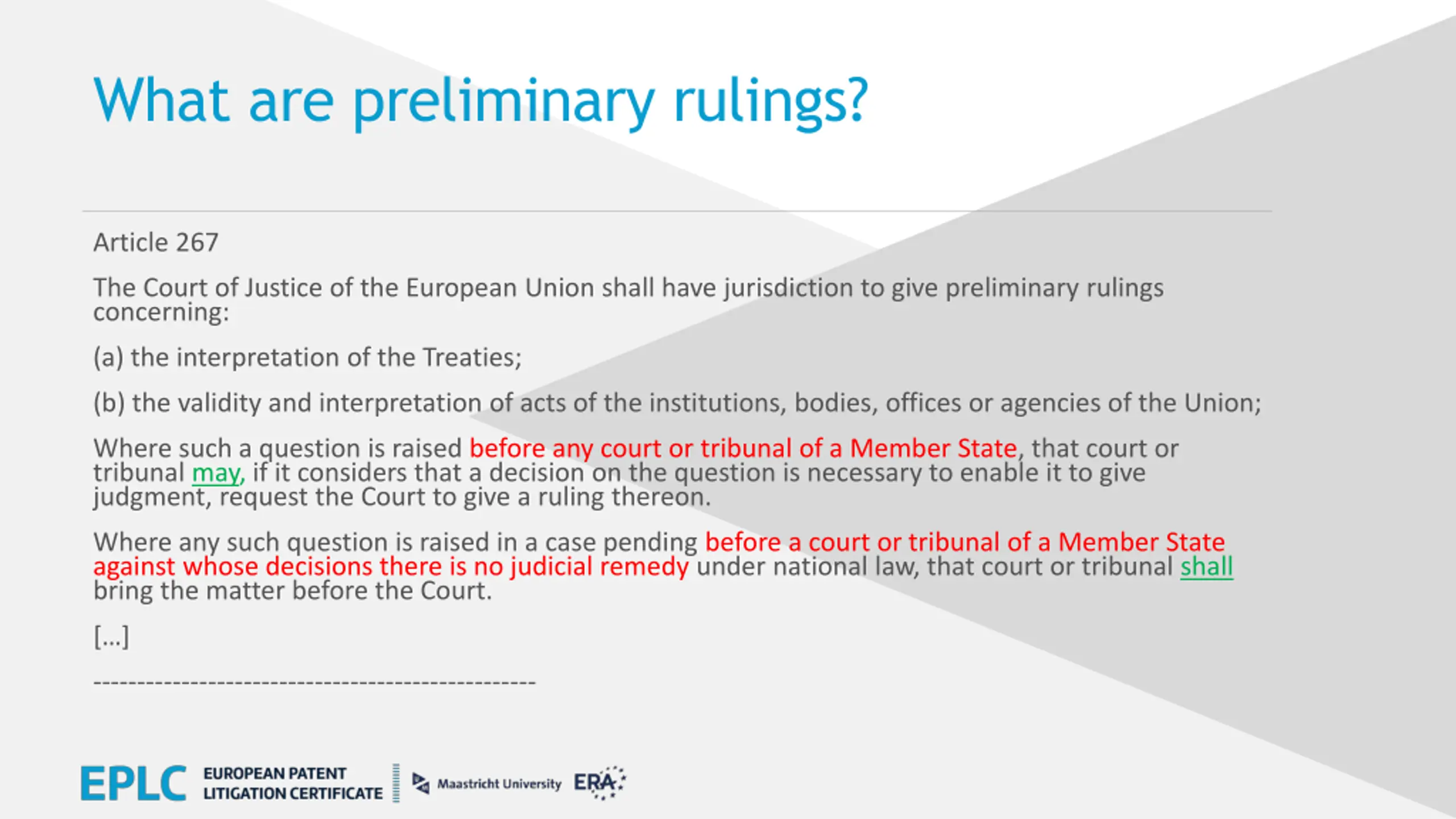 What are preliminary rulings? Article 267 The Court of Justice of the European Union shall have jurisdiction to give preliminary rulings concerning: (a) the interpretation of the Treaties; (b) the validity and interpretation of acts of the institutions, bodies, offices or agencies of the Union; Where such a question is raised before any court or tribunal of a Member State, that court or tribunal may, if it considers that a decision on the question is necessary to enable it to give judgment, request the Court to give a ruling thereon. Where any such question is raised in a case pending before a court or tribunal of a Member State against whose decisions there is no judicial remedy under national law, that court or tribunal shall bring the matter before the Court. [ ] --------------------------------------------------