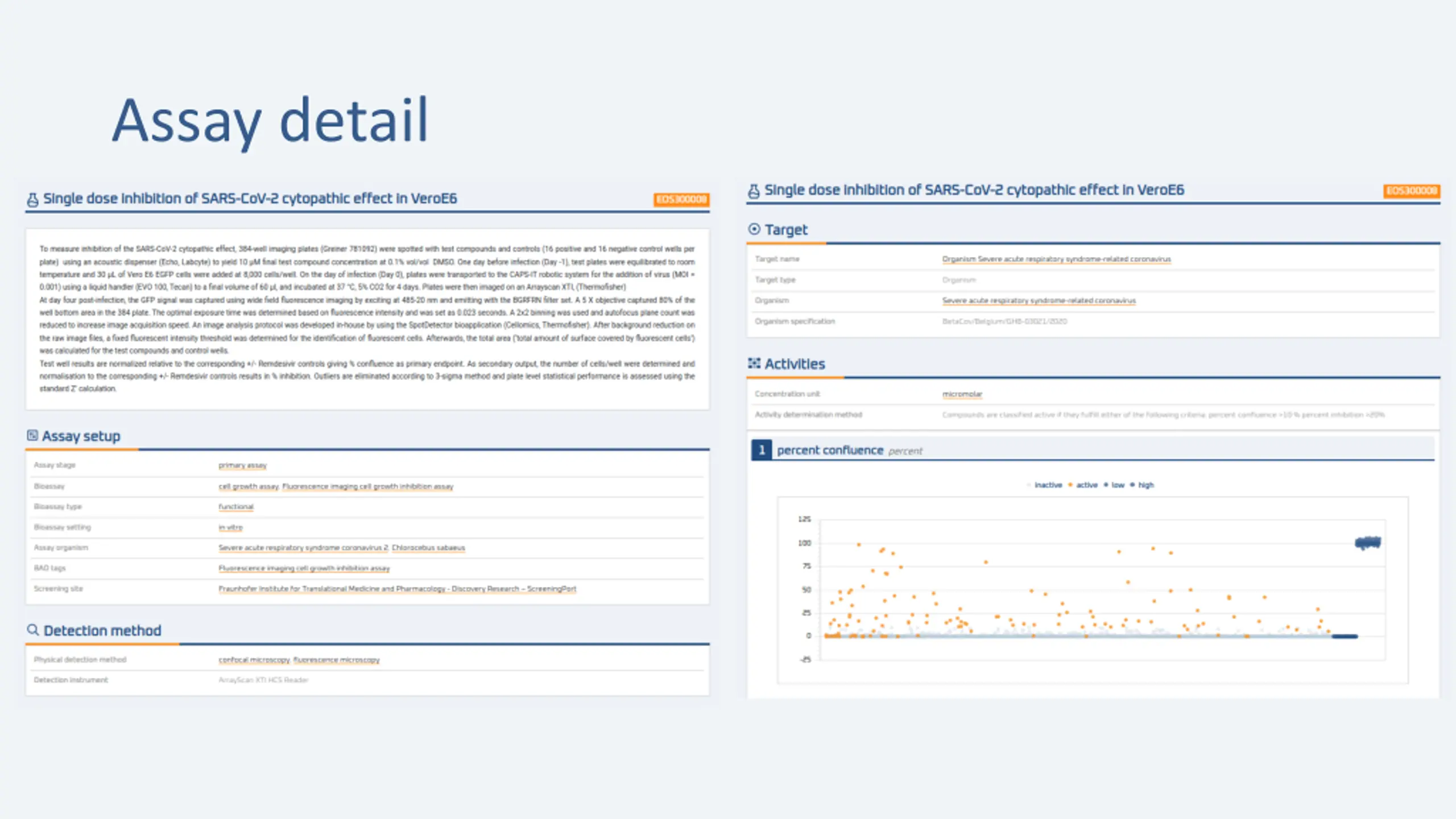Assays 5 public and 18 private assays on 5 targets Embargo up to 36 months Described with established ontologies such as BioAssayOntology, NCBI Taxonomy, ...