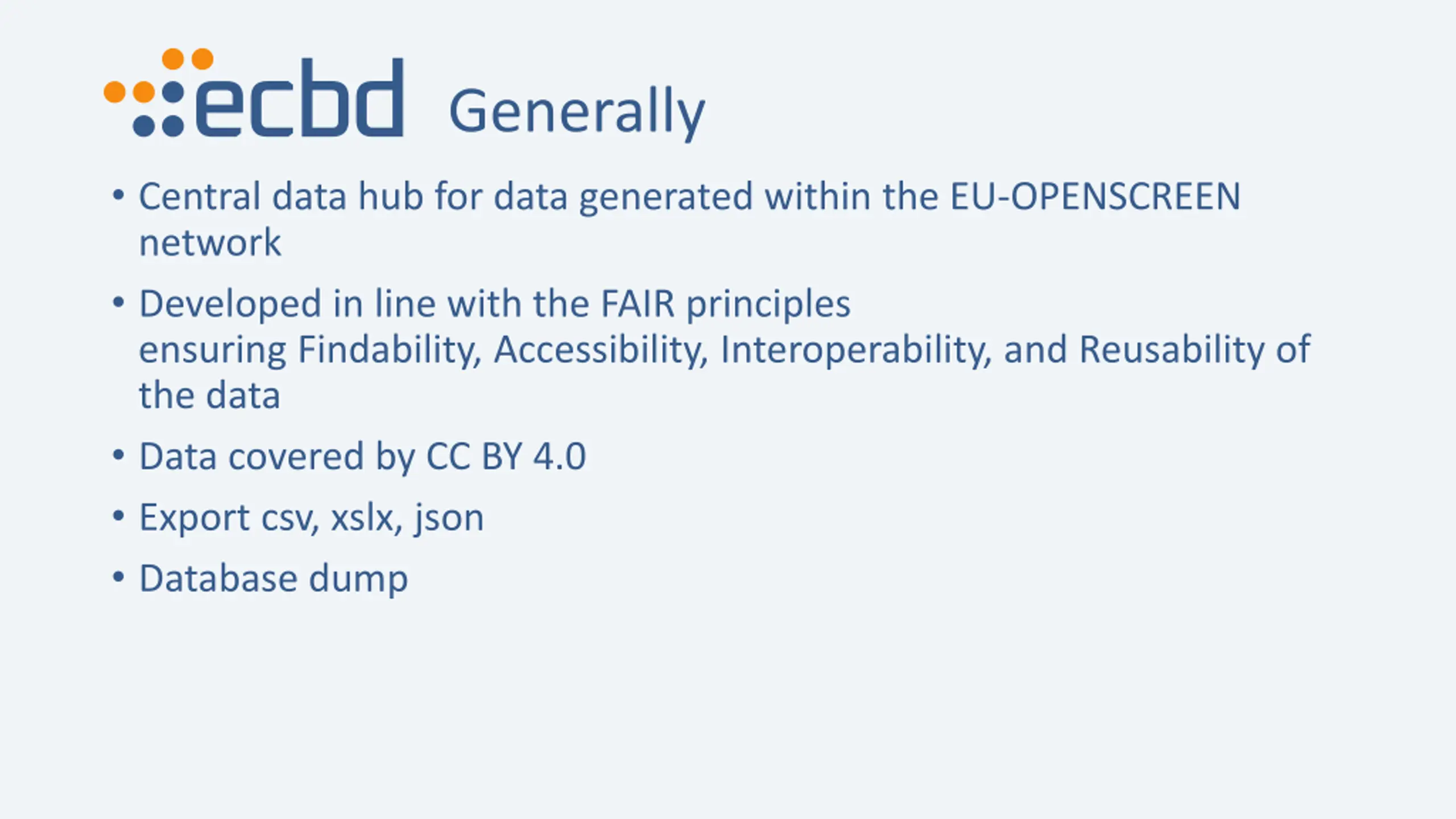Generally Central data hub for data generated within the EU-OPENSCREEN network Developed in line with the FAIR principles ensuring Findability, Accessibility, Interoperability, and Reusability of the data Data covered by CC BY 4.0 Export csv, xslx, json Database dump
