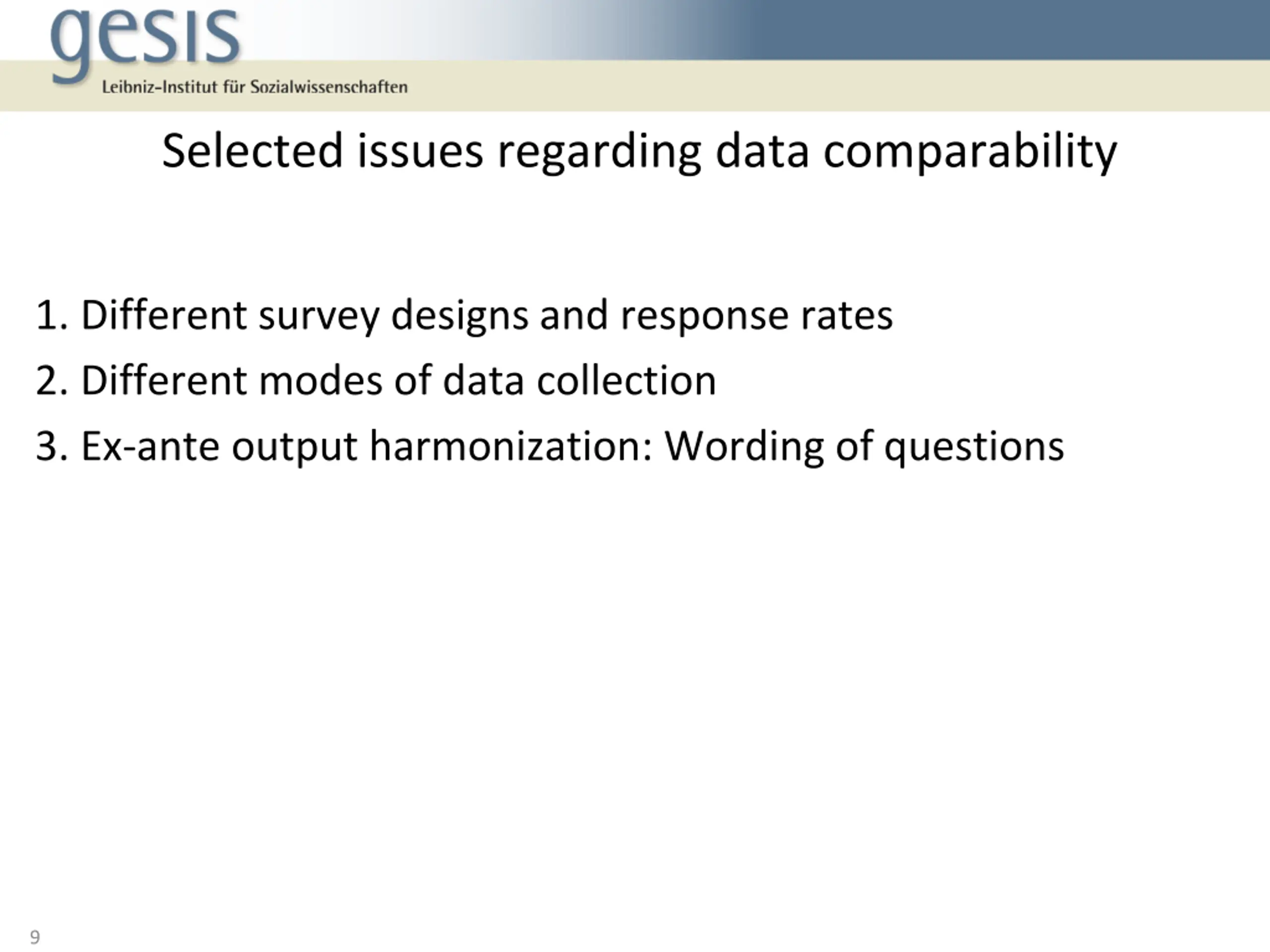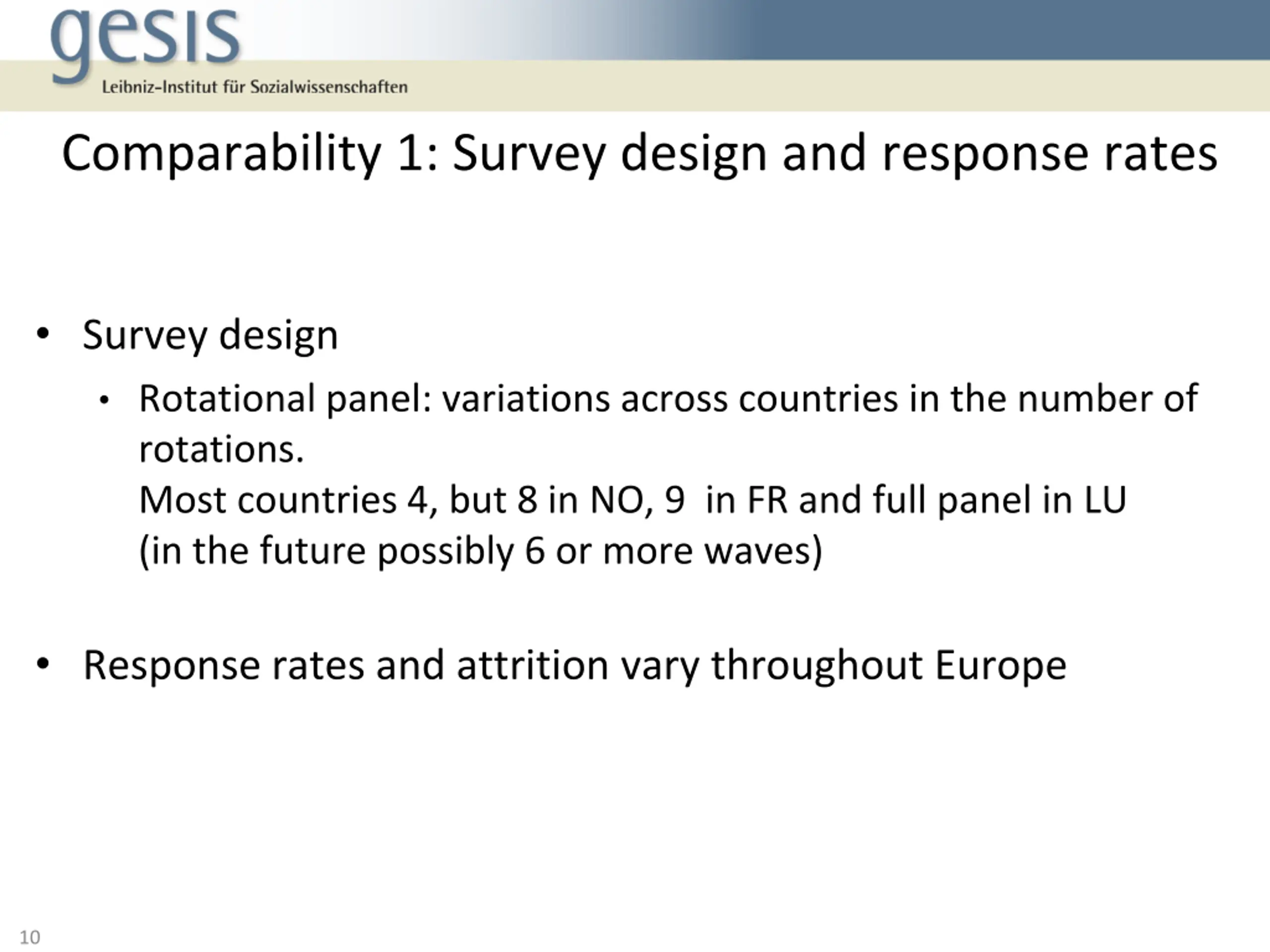 Selected issues regarding data comparability 1. Different survey designs and response rates 2. Different modes of data collection 3. Ex-ante output harmonization: Wording of questions 9