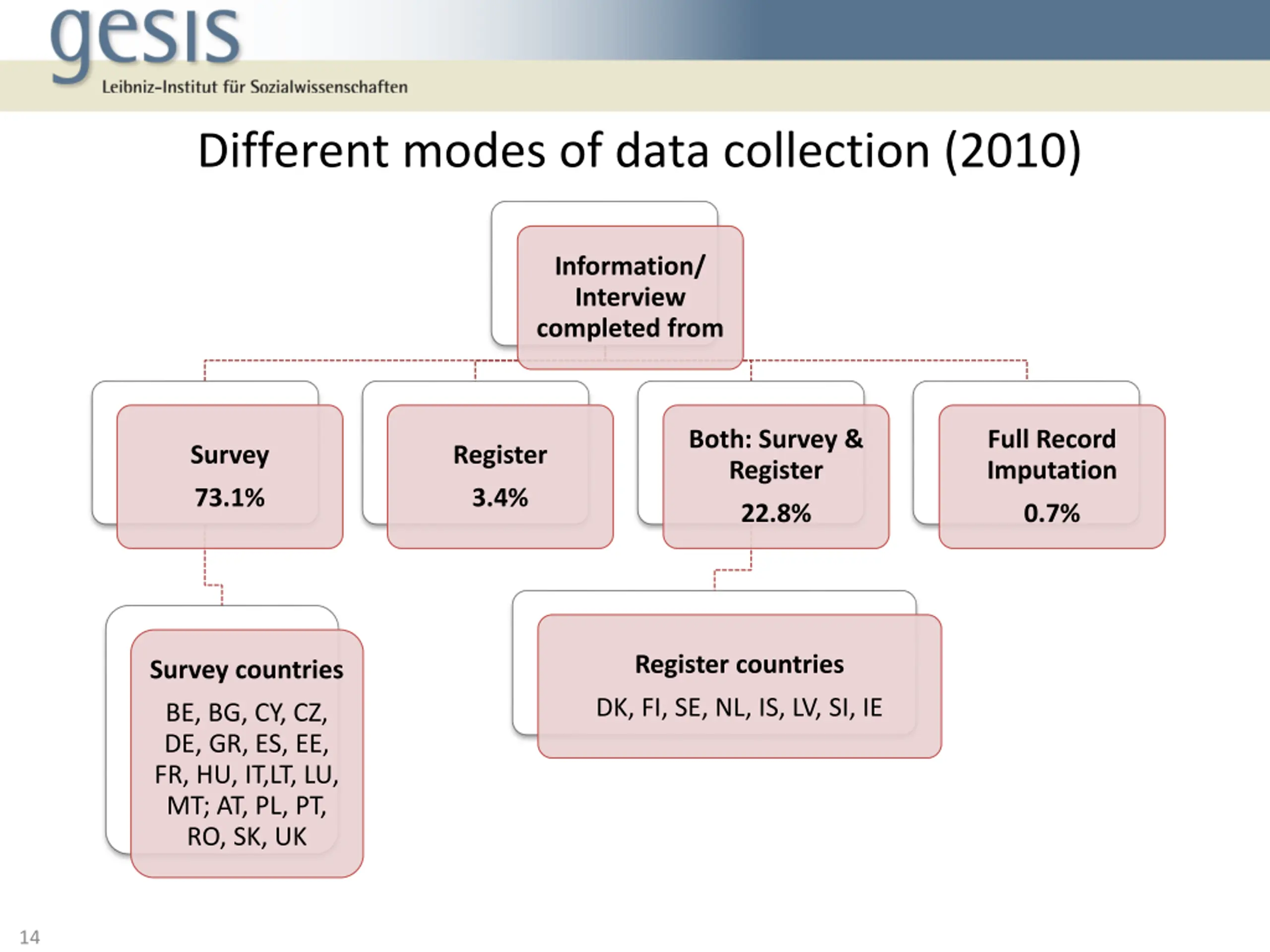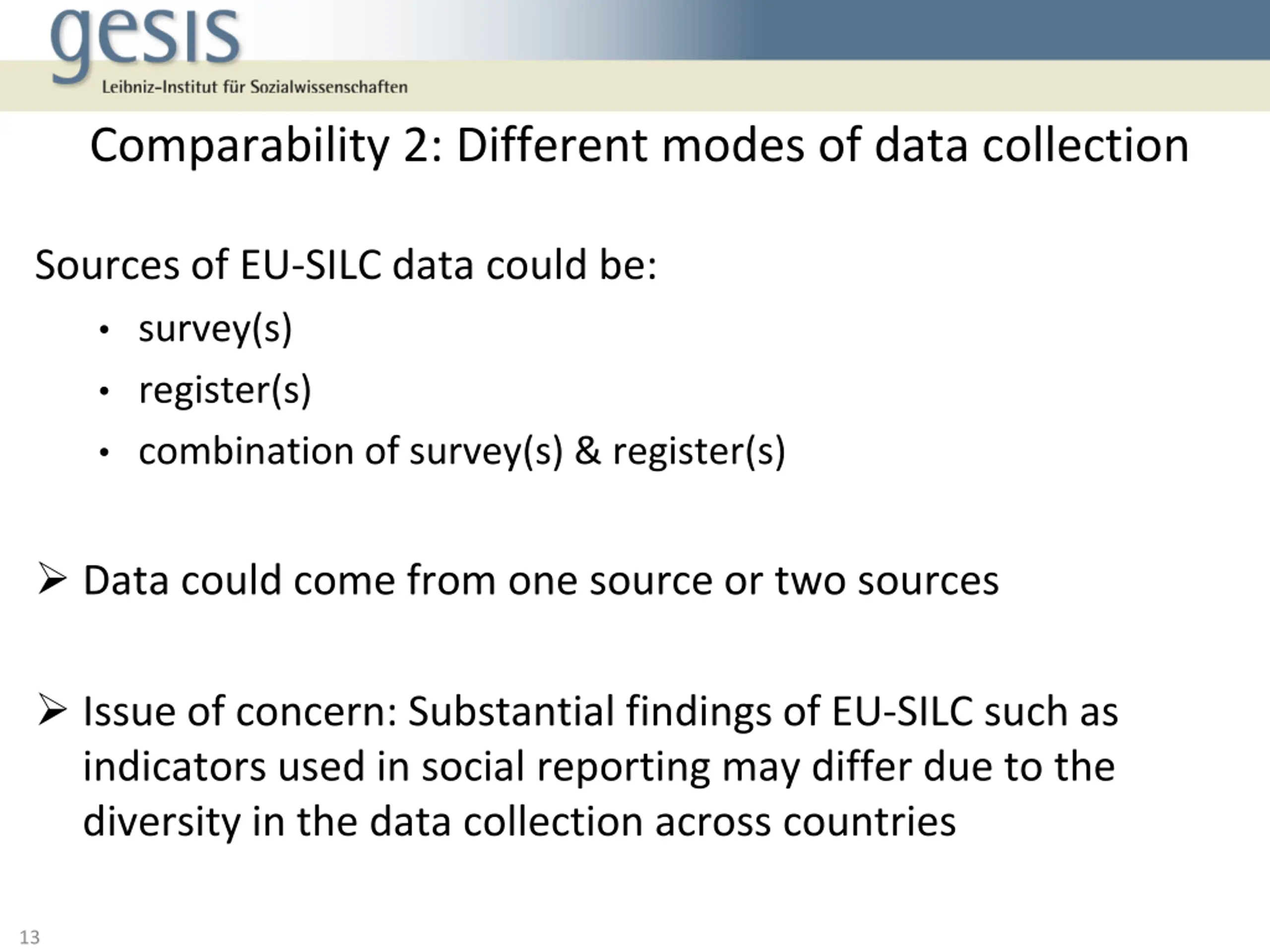 Comparability 2: Different modes of data collection Sources of EU-SILC data could be: survey(s) register(s) combination of survey(s) & register(s) Data could come from one source or two sources Issue of concern: Substantial findings of EU-SILC such as indicators used in social reporting may differ due to the diversity in the data collection across countries 13