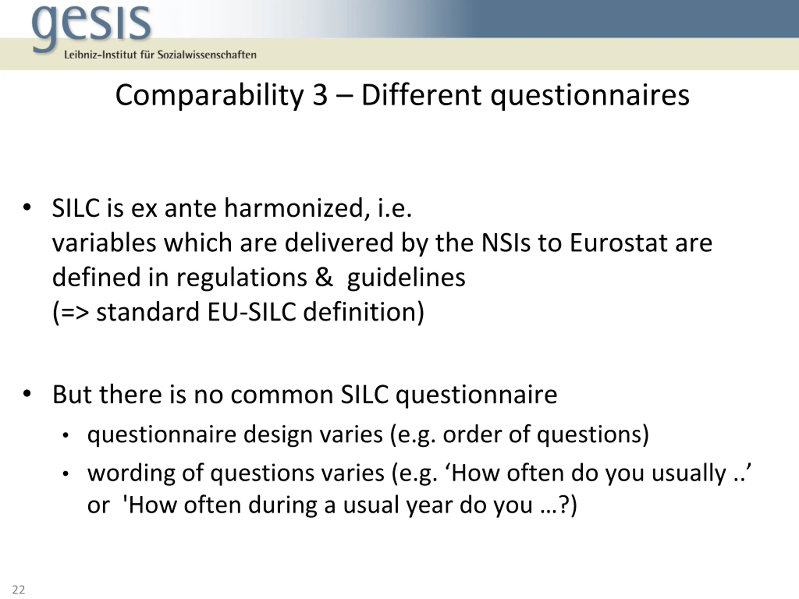 Comparability 3 Different questionnaires SILC is ex ante harmonized, i.e. variables which are delivered by the NSIs to Eurostat are defined in regulations & guidelines (=> standard EU-SILC definition) But there is no common SILC questionnaire questionnaire design varies (e.g. order of questions) wording of questions varies (e.g. How often do you usually .. or 'How often during a usual year do you ?) 22
