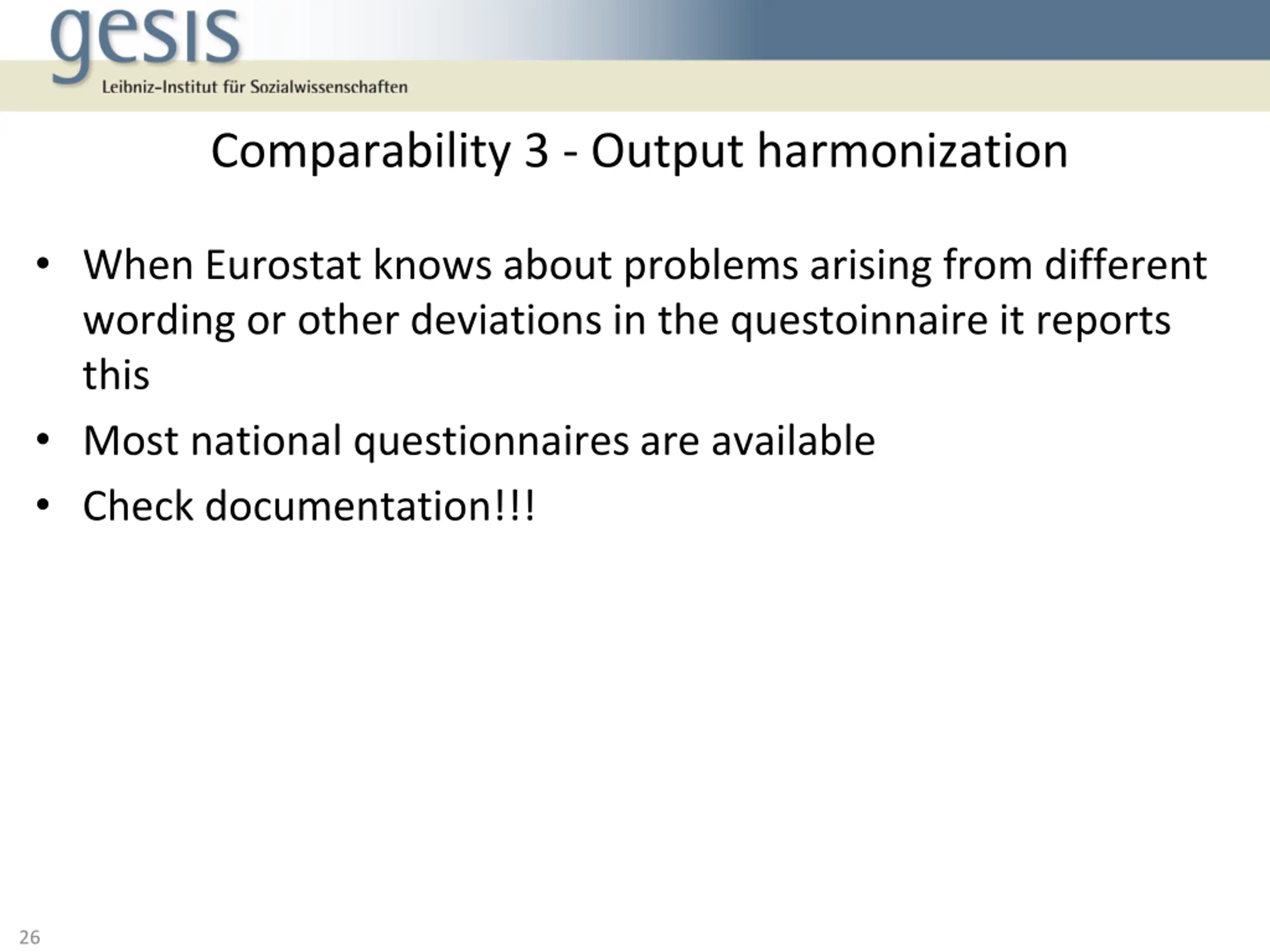 Comparability 3 - Output harmonization When Eurostat knows about problems arising from different wording or other deviations in the questoinnaire it reports this Most national questionnaires are available Check documentation!!! 26