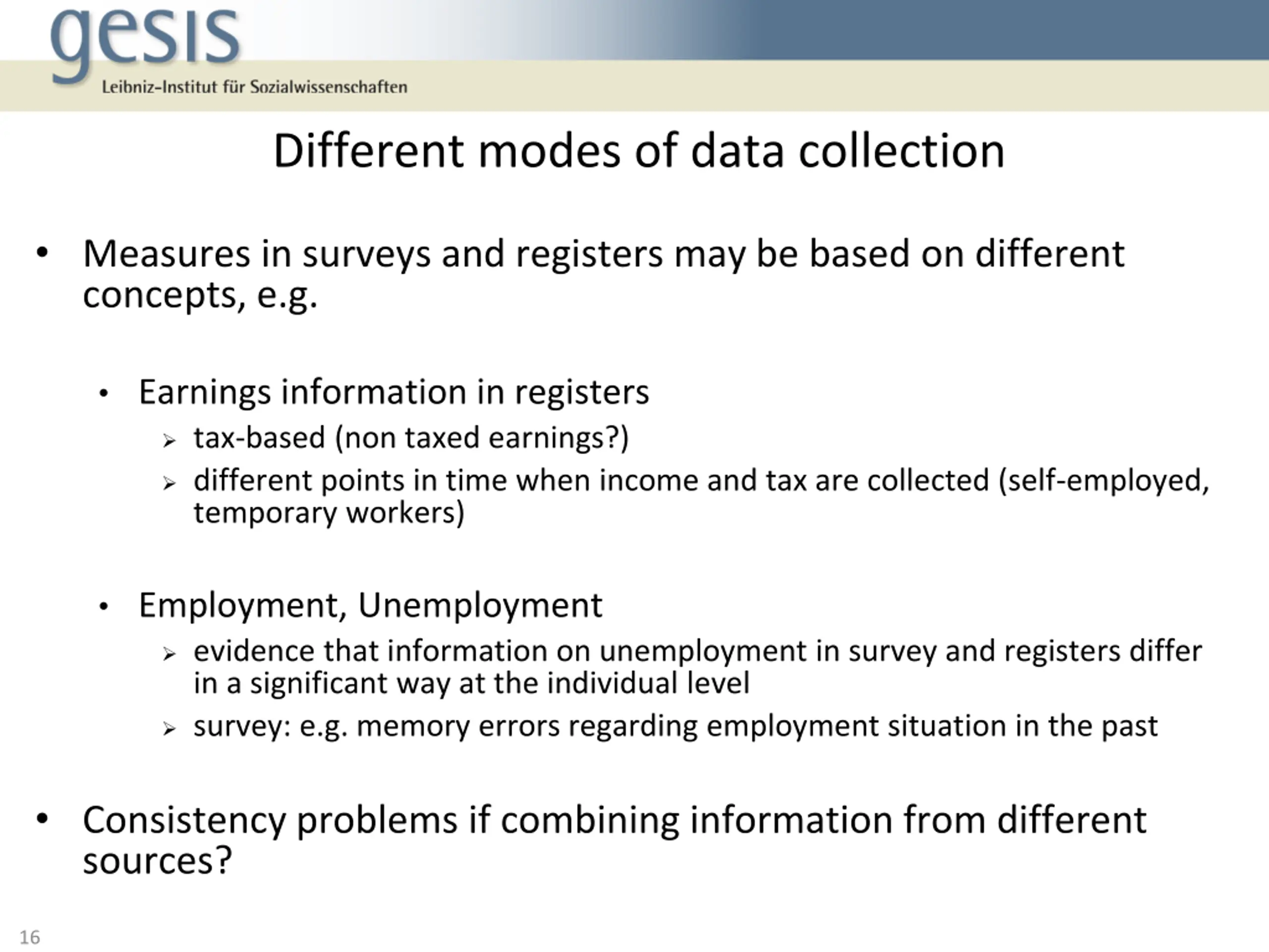 Different modes of data collection Measures in surveys and registers may be based on different concepts, e.g. Earnings information in registers tax-based (non taxed earnings?) different points in time when income and tax are collected (self-employed, temporary workers) Employment, Unemployment evidence that information on unemployment in survey and registers differ in a significant way at the individual level survey: e.g. memory errors regarding employment situation in the past Consistency problems if combining information from different sources? 16