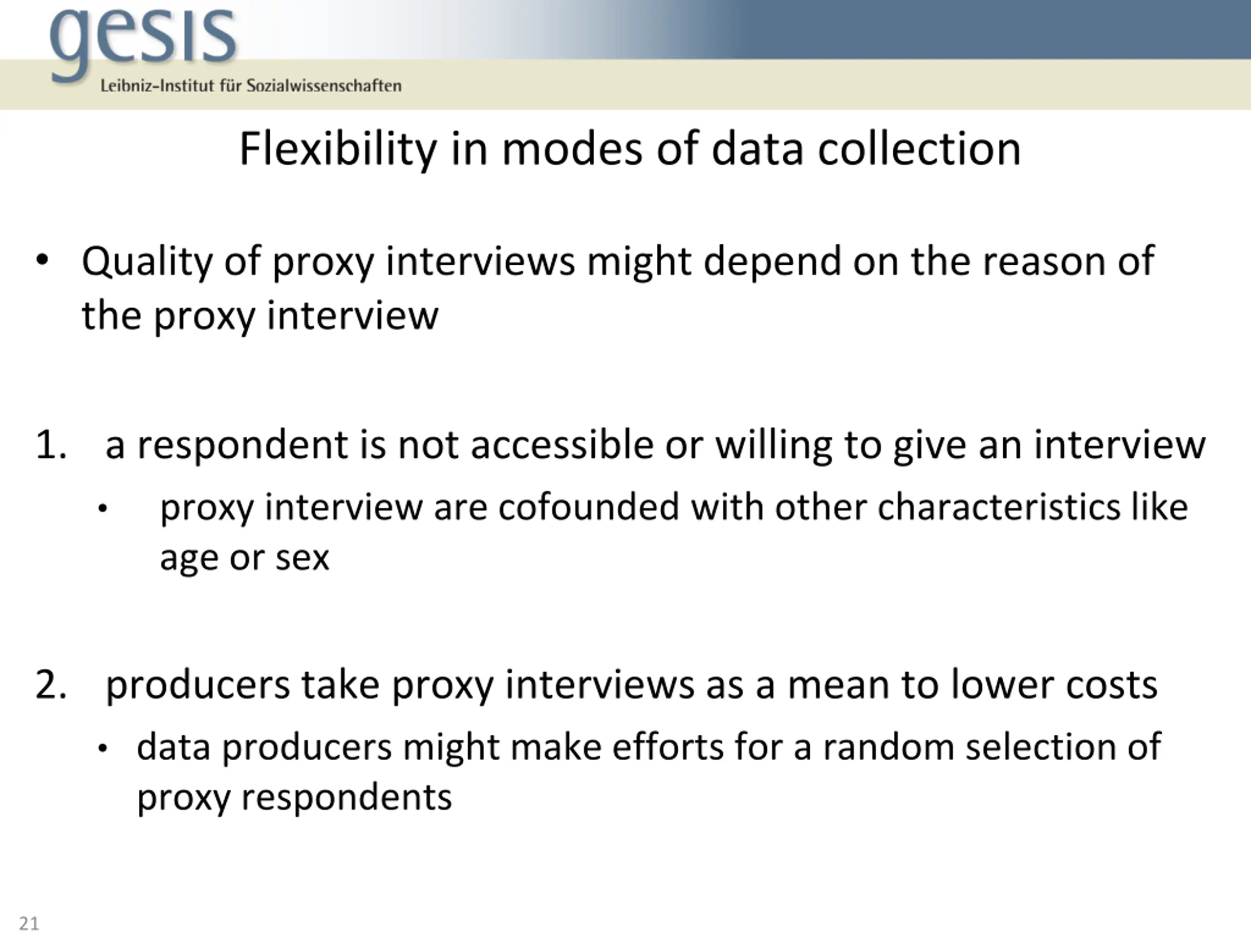 Flexibility in modes of data collection Quality of proxy interviews might depend on the reason of the proxy interview 1. a respondent is not accessible or willing to give an interview proxy interview are cofounded with other characteristics like age or sex 2. producers take proxy interviews as a mean to lower costs data producers might make efforts for a random selection of proxy respondents 21