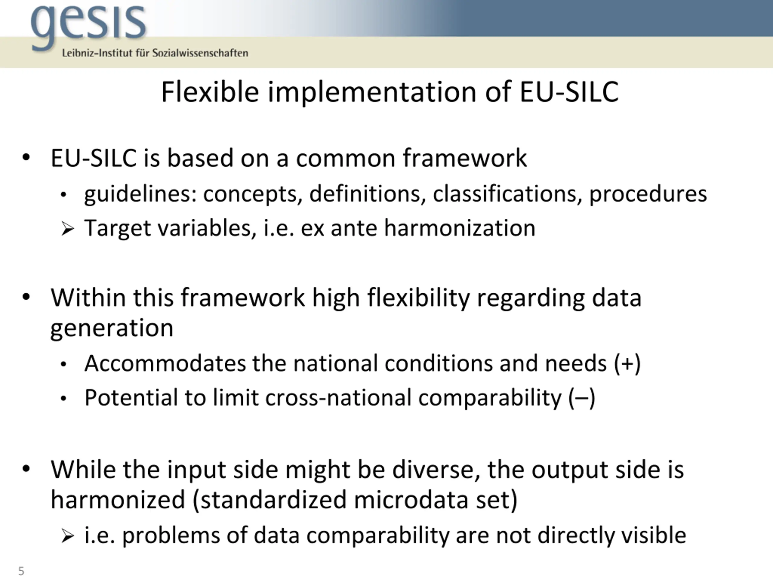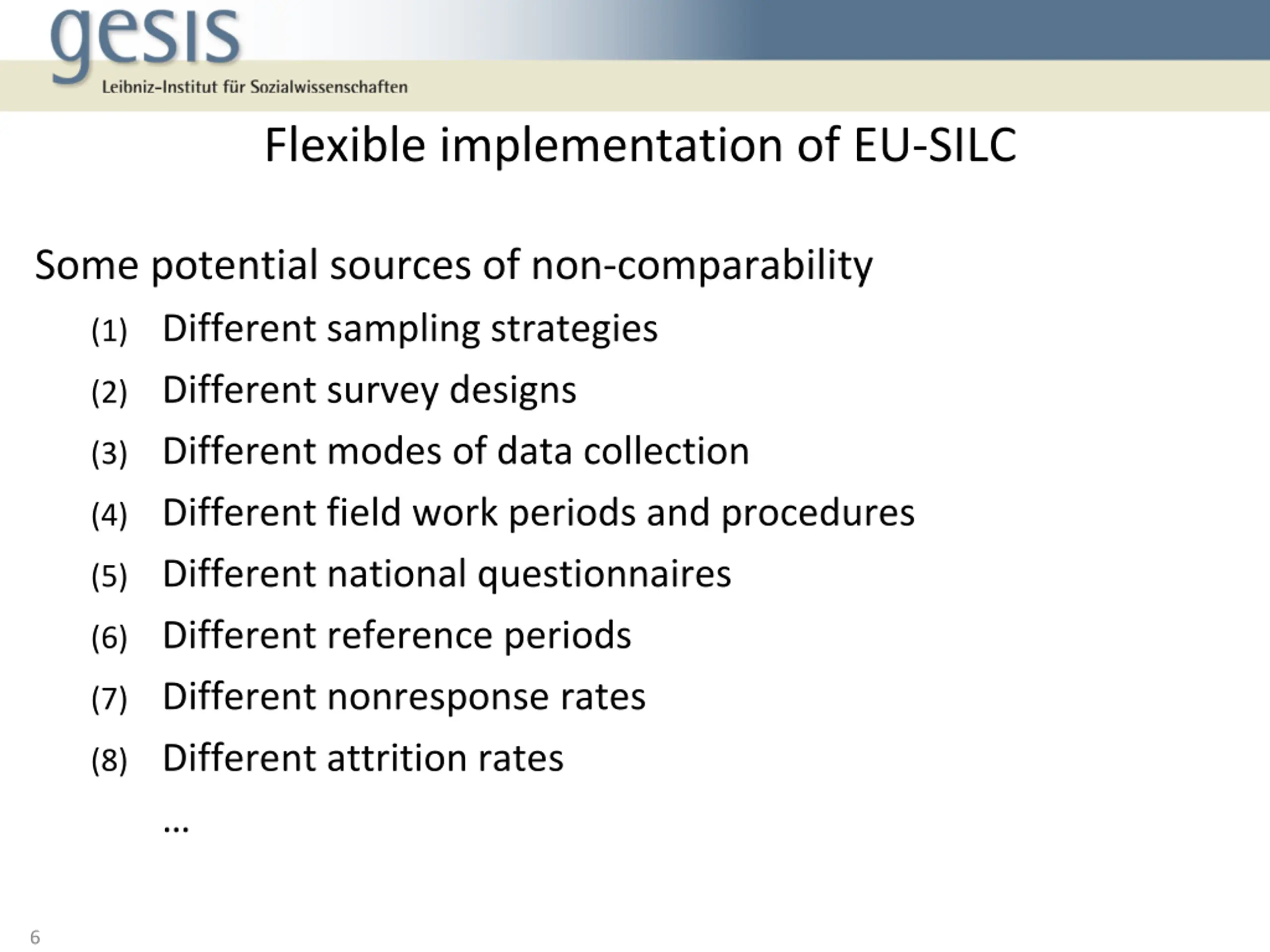 Flexible implementation of EU-SILC EU-SILC is based on a common framework guidelines: concepts, definitions, classifications, procedures Target variables, i.e. ex ante harmonization Within this framework high flexibility regarding data generation Accommodates the national conditions and needs (+) Potential to limit cross-national comparability ( ) While the input side might be diverse, the output side is harmonized (standardized microdata set) i.e. problems of data comparability are not directly visible 5