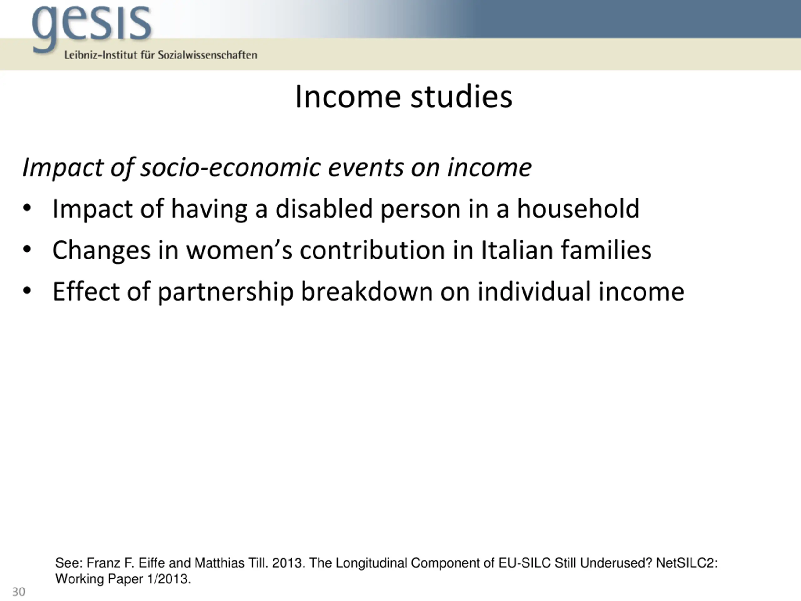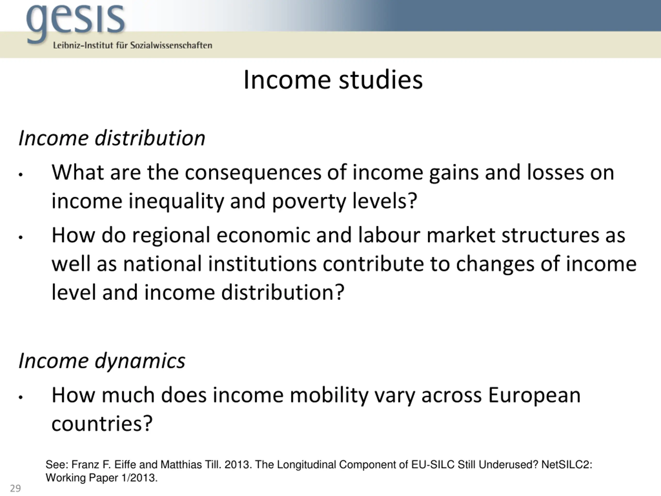Income studies Income distribution What are the consequences of income gains and losses on income inequality and poverty levels? How do regional economic and labour market structures as well as national institutions contribute to changes of income level and income distribution? Income dynamics How much does income mobility vary across European countries? See: Franz F. Eiffe and Matthias Till. 2013. The Longitudinal Component of EU SILC Still Underused? NetSILC2: Working Paper 1/2013. 29