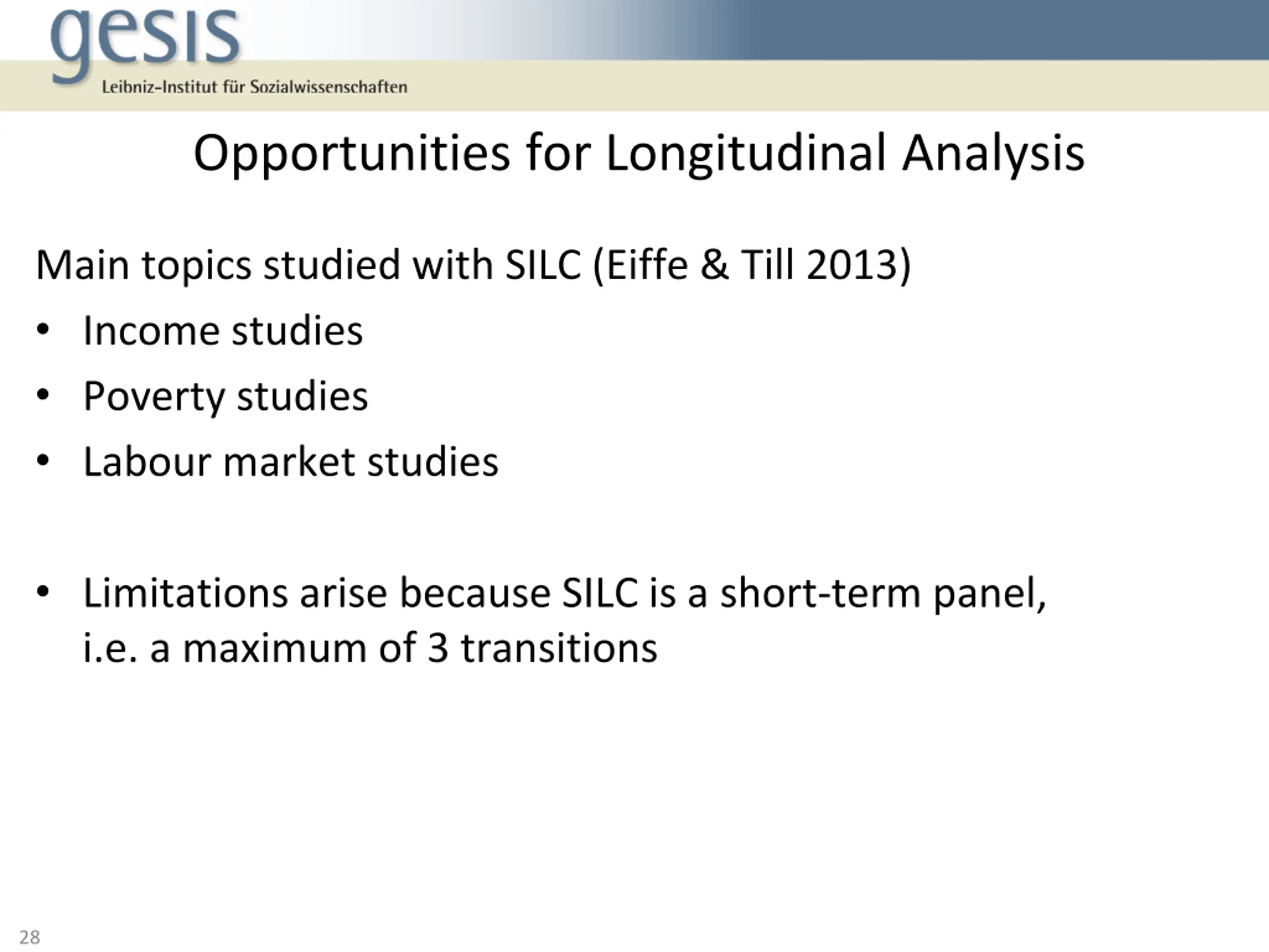 Opportunities for Longitudinal Analysis Main topics studied with SILC (Eiffe & Till 2013) Income studies Poverty studies Labour market studies Limitations arise because SILC is a short-term panel, i.e. a maximum of 3 transitions 28