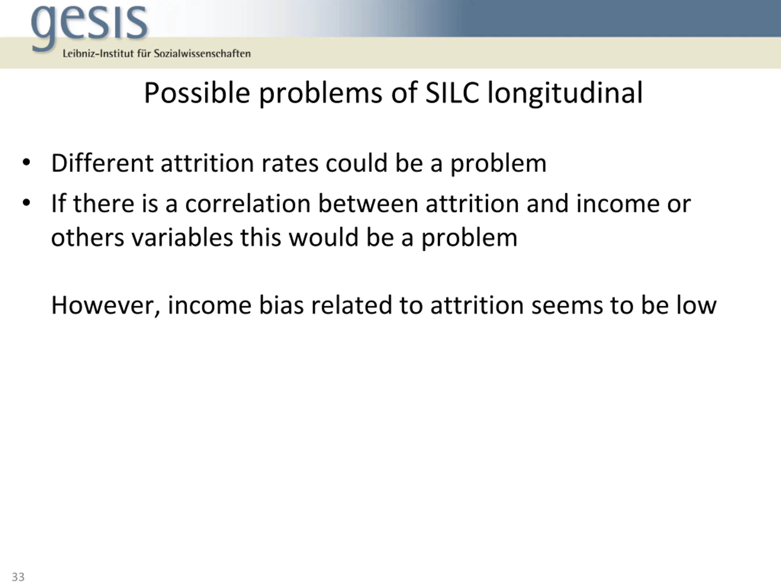 Possible problems of SILC longitudinal Different attrition rates could be a problem If there is a correlation between attrition and income or others variables this would be a problem However, income bias related to attrition seems to be low 33
