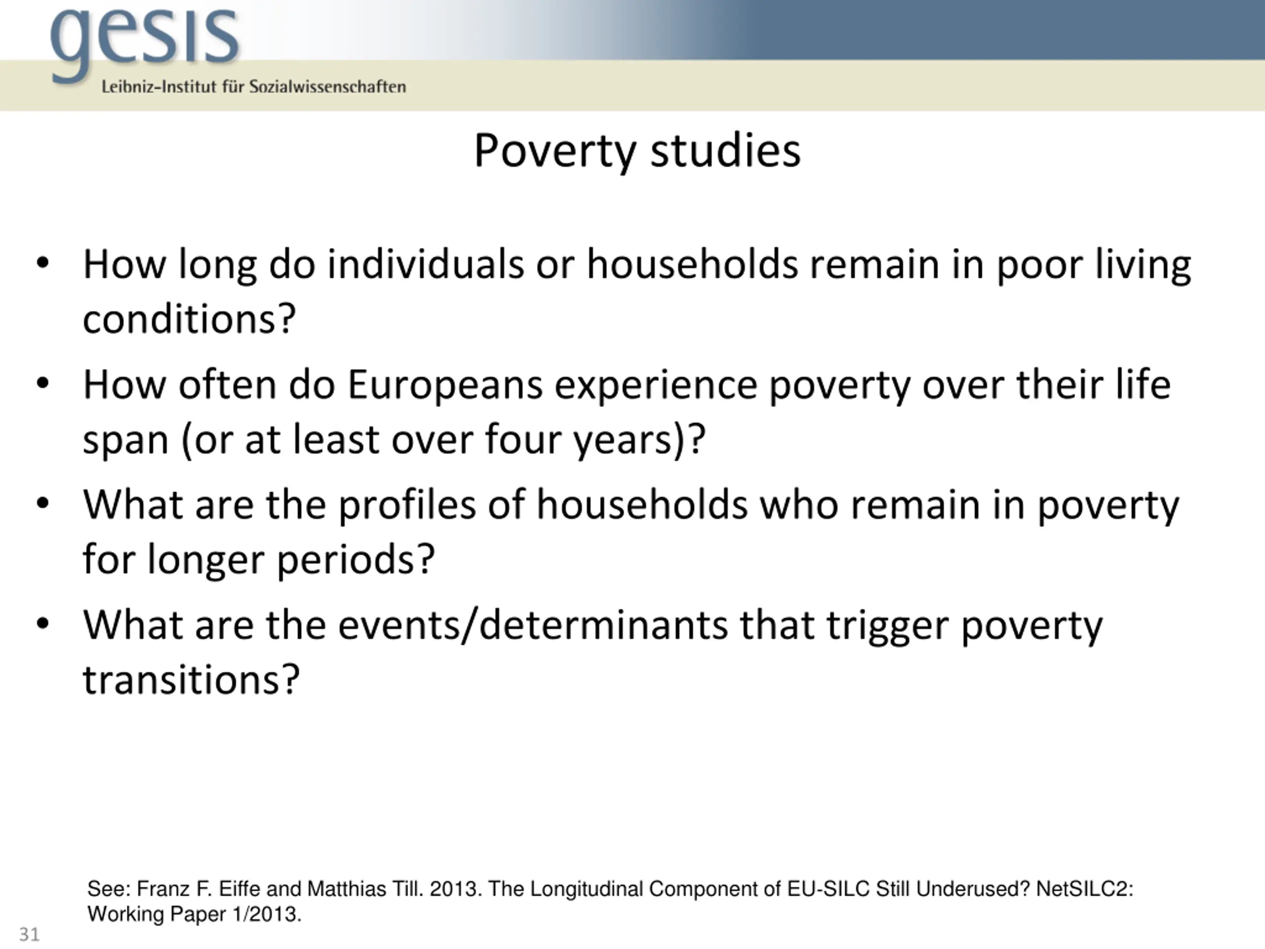 Poverty studies How long do individuals or households remain in poor living conditions? How often do Europeans experience poverty over their life span (or at least over four years)? What are the profiles of households who remain in poverty for longer periods? What are the events/determinants that trigger poverty transitions? See: Franz F. Eiffe and Matthias Till. 2013. The Longitudinal Component of EU SILC Still Underused? NetSILC2: Working Paper 1/2013. 31