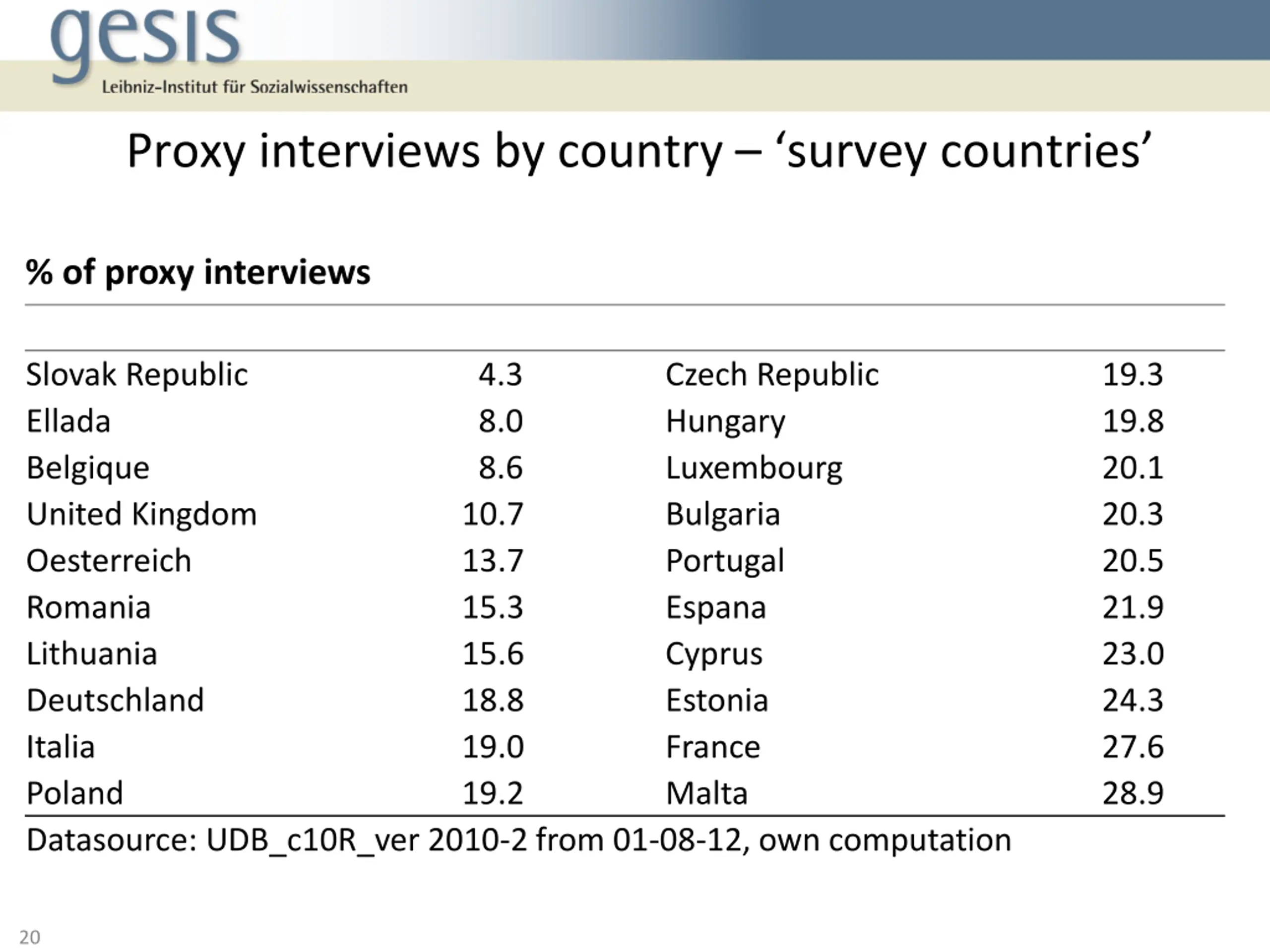 Proxy interview by country register countries % of proxy interviews Country Iceland proxy interview 0.0 Nederland 1.2 Sverige 2.1 Ireland 23.7 Latvia 23.7 Norway 23.8 Slovenia 24.6 As a rule only 1 person in hh is interviewed, who answers also for all other hh members Suomi 42.7 Danmark 48.6 Datasource: UDB_c10R_ver 2010-2 from 01-08-12, own computation 19