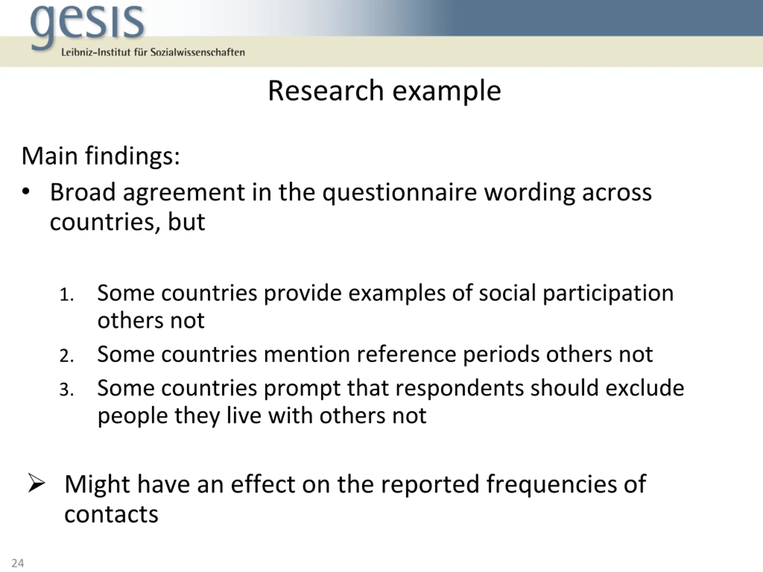 Research example Main findings: Broad agreement in the questionnaire wording across countries, but 1. Some countries provide examples of social participation others not 2. Some countries mention reference periods others not 3. Some countries prompt that respondents should exclude people they live with others not Might have an effect on the reported frequencies of contacts 24