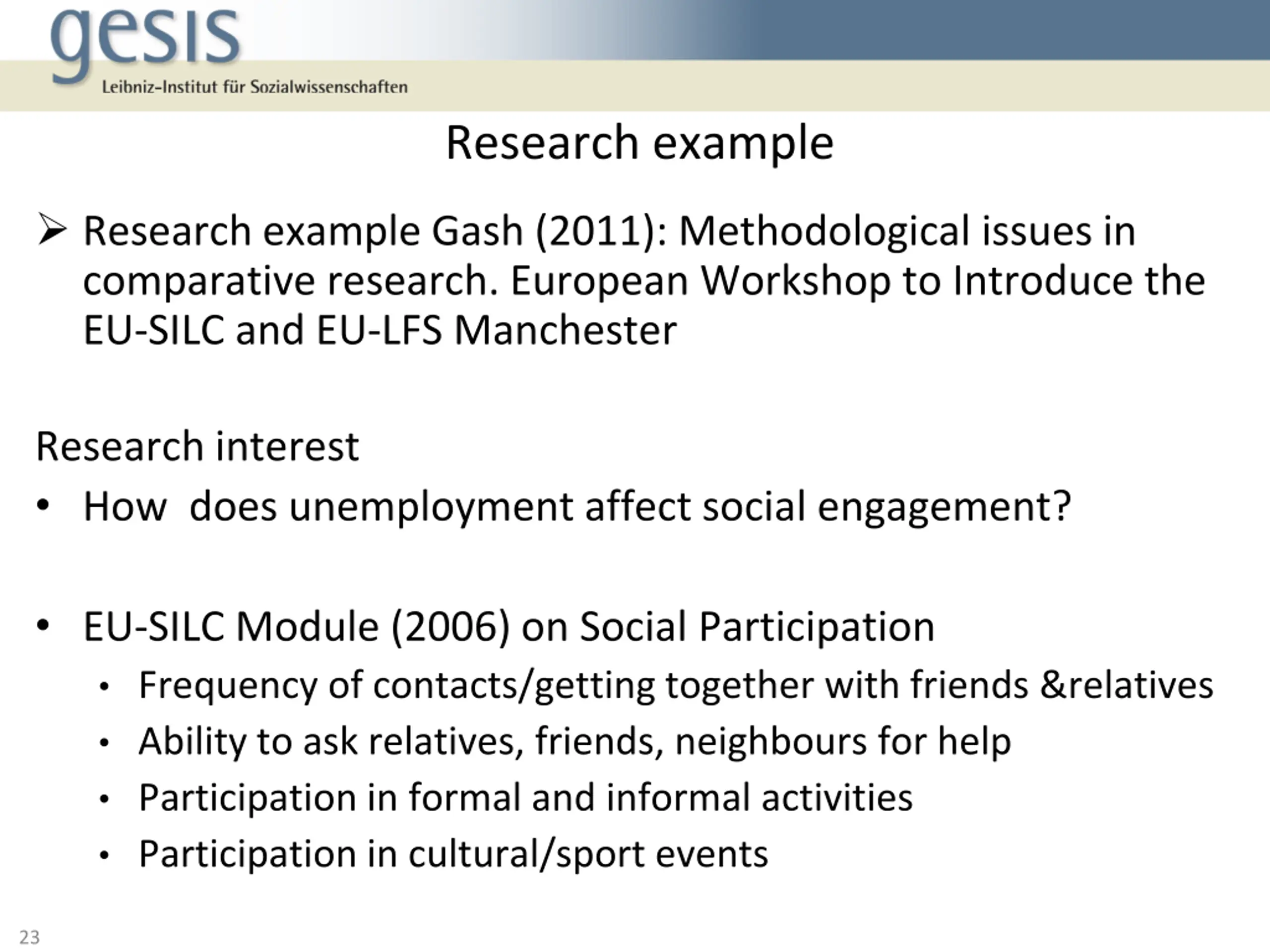 Research example Research example Gash (2011): Methodological issues in comparative research. European Workshop to Introduce the EU-SILC and EU-LFS Manchester Research interest How does unemployment affect social engagement? EU-SILC Module (2006) on Social Participation Frequency of contacts/getting together with friends &relatives Ability to ask relatives, friends, neighbours for help Participation in formal and informal activities Participation in cultural/sport events 23