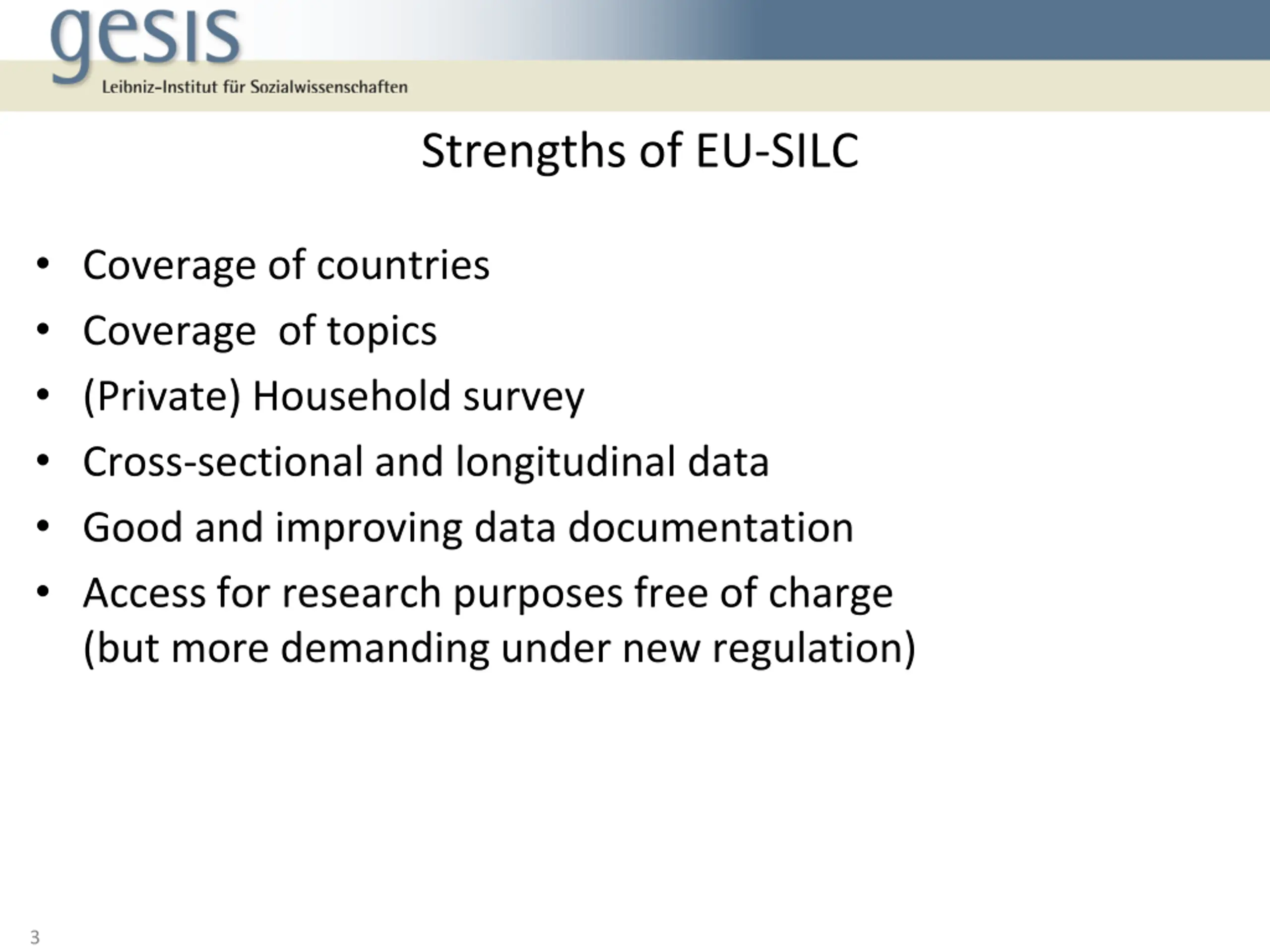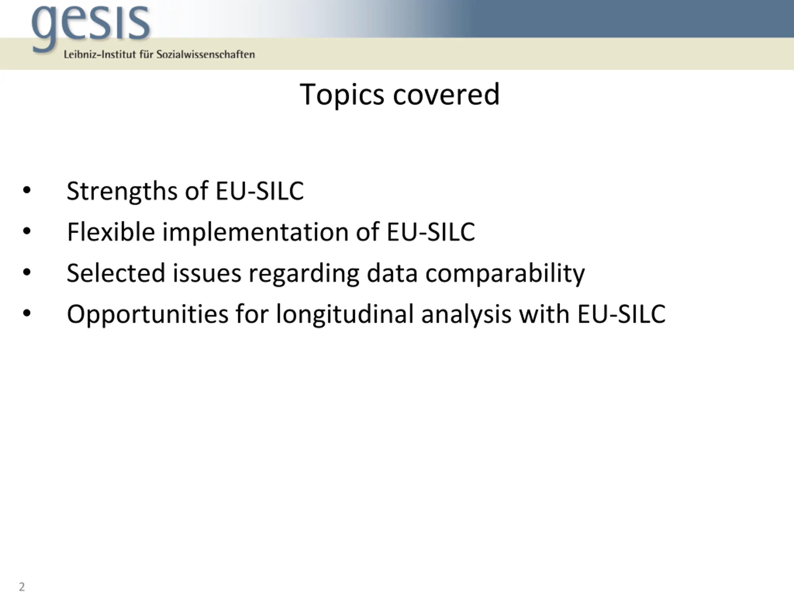 Topics covered Strengths of EU-SILC Flexible implementation of EU-SILC Selected issues regarding data comparability Opportunities for longitudinal analysis with EU-SILC 2