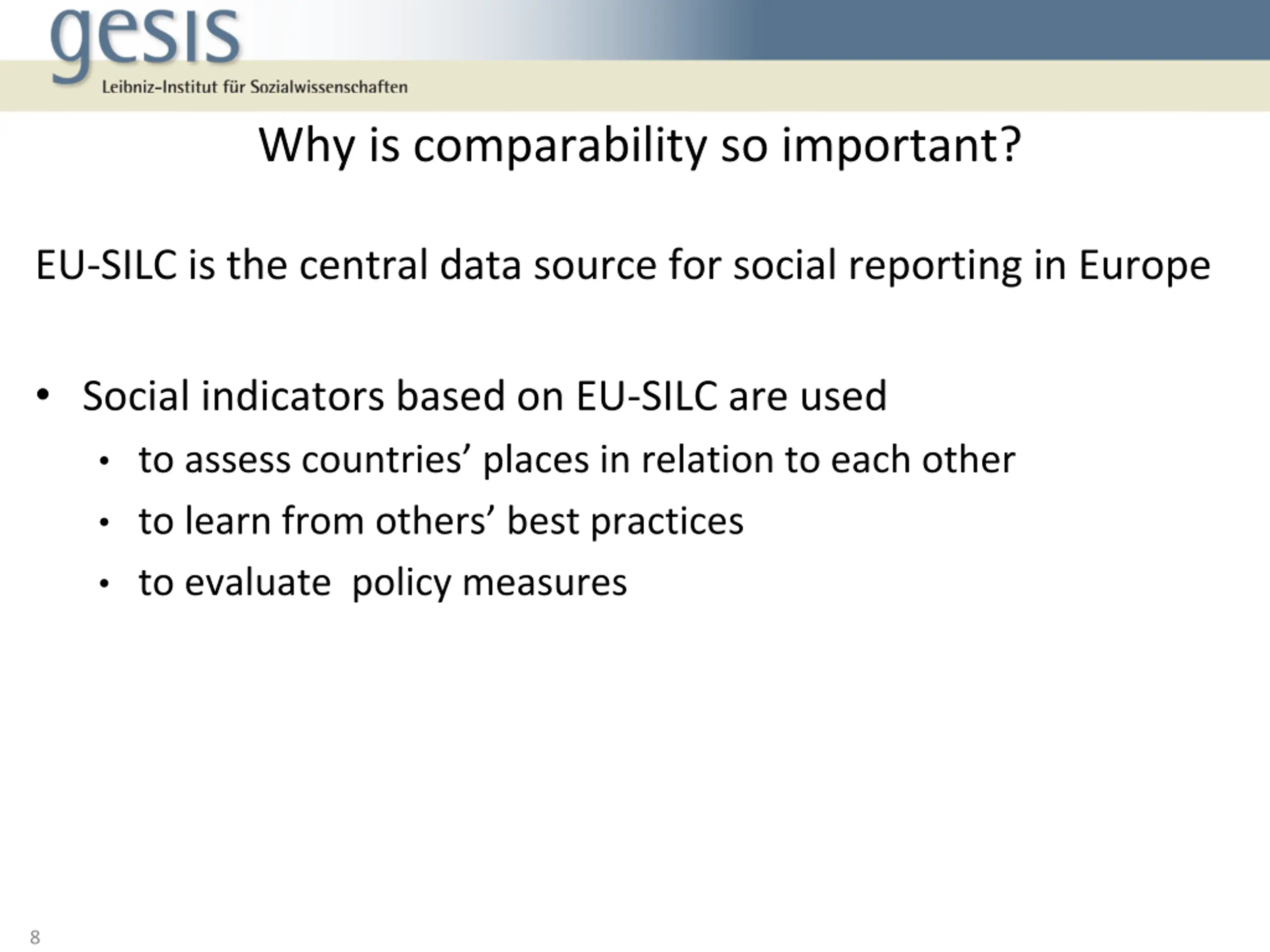 Why is comparability so important? EU-SILC is the central data source for social reporting in Europe Social indicators based on EU-SILC are used to assess countries places in relation to each other to learn from others best practices to evaluate policy measures 8