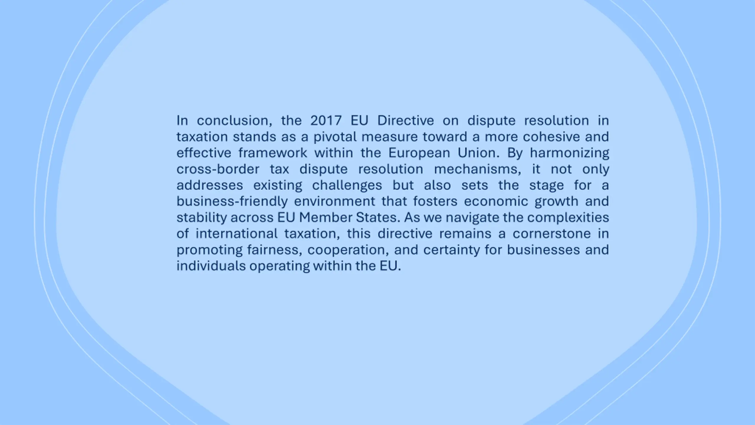 In conclusion, the 2017 EU Directive on dispute resolution in taxation stands as a pivotal measure toward a more cohesive and effective framework within the European Union. By harmonizing cross-border tax dispute resolution mechanisms, it not only addresses existing challenges but also sets the stage for a business-friendly environment that fosters economic growth and stability across EU Member States. As we navigate the complexities of international taxation, this directive remains a cornerstone in promoting fairness, cooperation, and certainty for businesses and individuals operating within the EU.
