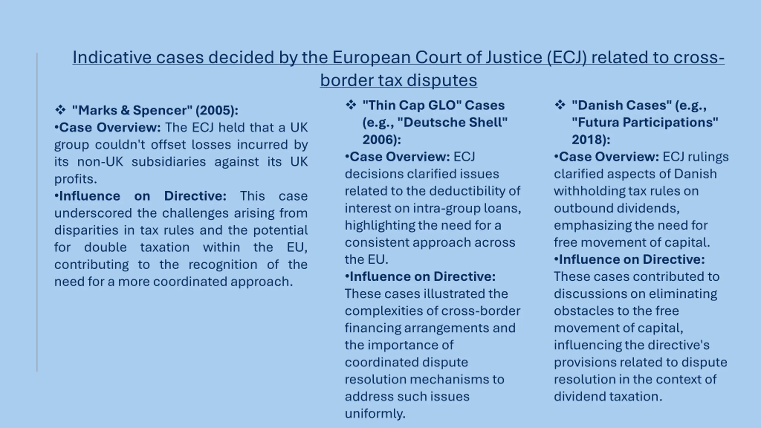 Indicative cases decided by the European Court of Justice (ECJ) related to cross- border tax disputes "Thin Cap GLO" Cases (e.g., "Deutsche Shell" 2006): Case Overview: ECJ decisions clarified issues related to the deductibility of interest on intra-group loans, highlighting the need for a consistent approach across the EU. Influence on Directive: These cases illustrated the complexities of cross-border financing arrangements and the importance of coordinated dispute resolution mechanisms to address such issues uniformly. "Danish Cases" (e.g., "Futura Participations" 2018): Case Overview: ECJ rulings clarified aspects of Danish withholding tax rules on outbound dividends, emphasizing the need for free movement of capital. Influence on Directive: These cases contributed to discussions on eliminating obstacles to the free movement of capital, influencing the directive's provisions related to dispute resolution in the context of dividend taxation. "Marks & Spencer" (2005): Case Overview: The ECJ held that a UK group couldn't offset losses incurred by its non-UK subsidiaries against its UK profits. Influence on Directive: This case underscored the challenges arising from disparities in tax rules and the potential for double taxation within the EU, contributing to the recognition of the need for a more coordinated approach.