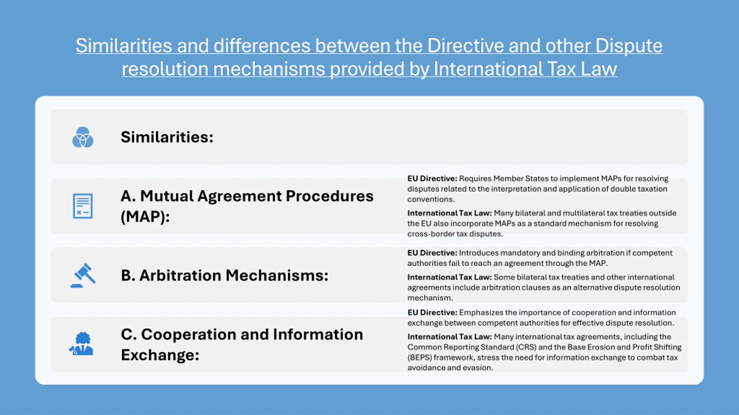 Similarities and differences between the Directive and other Dispute resolution mechanisms provided by International Tax Law Similarities: EU Directive: Requires Member States to implement MAPs for resolving disputes related to the interpretation and application of double taxation conventions. International Tax Law: Many bilateral and multilateral tax treaties outside the EU also incorporate MAPs as a standard mechanism for resolving cross-border tax disputes. A. Mutual Agreement Procedures (MAP): EU Directive: Introduces mandatory and binding arbitration if competent authorities fail to reach an agreement through the MAP. International Tax Law: Some bilateral tax treaties and other international agreements include arbitration clauses as an alternative dispute resolution mechanism. B. Arbitration Mechanisms: EU Directive: Emphasizes the importance of cooperation and information exchange between competent authorities for effective dispute resolution. International Tax Law: Many international tax agreements, including the Common Reporting Standard (CRS) and the Base Erosion and Profit Shifting (BEPS) framework, stress the need for information exchange to combat tax avoidance and evasion. C. Cooperation and Information Exchange: