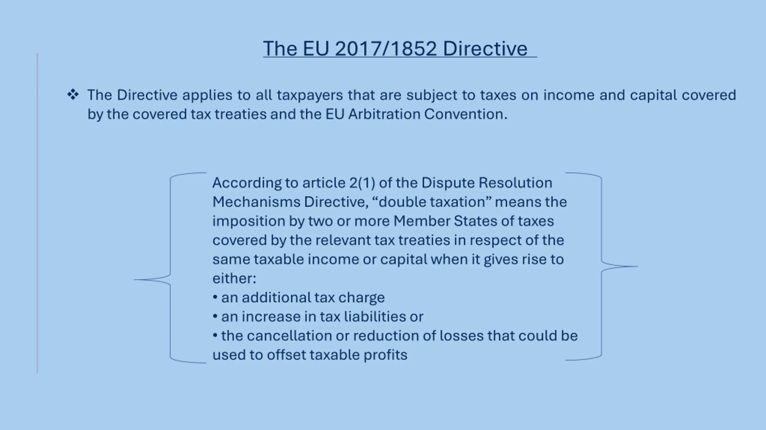 The EU 2017/1852 Directive The Directive applies to all taxpayers that are subject to taxes on income and capital covered by the covered tax treaties and the EU Arbitration Convention. According to article 2(1) of the Dispute Resolution Mechanisms Directive, double taxation means the imposition by two or more Member States of taxes covered by the relevant tax treaties in respect of the same taxable income or capital when it gives rise to either: an additional tax charge an increase in tax liabilities or the cancellation or reduction of losses that could be used to offset taxable profits