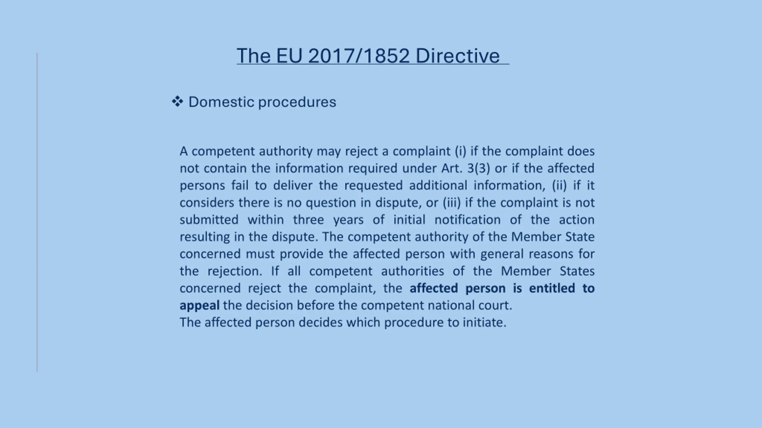 The EU 2017/1852 Directive Domestic procedures A competent authority may reject a complaint (i) if the complaint does not contain the information required under Art. 3(3) or if the affected persons fail to deliver the requested additional information, (ii) if it considers there is no question in dispute, or (iii) if the complaint is not submitted within three years of initial notification of the action resulting in the dispute. The competent authority of the Member State concerned must provide the affected person with general reasons for the rejection. If all competent authorities of the Member States concerned reject the complaint, the affected person is entitled to appeal the decision before the competent national court. The affected person decides which procedure to initiate.