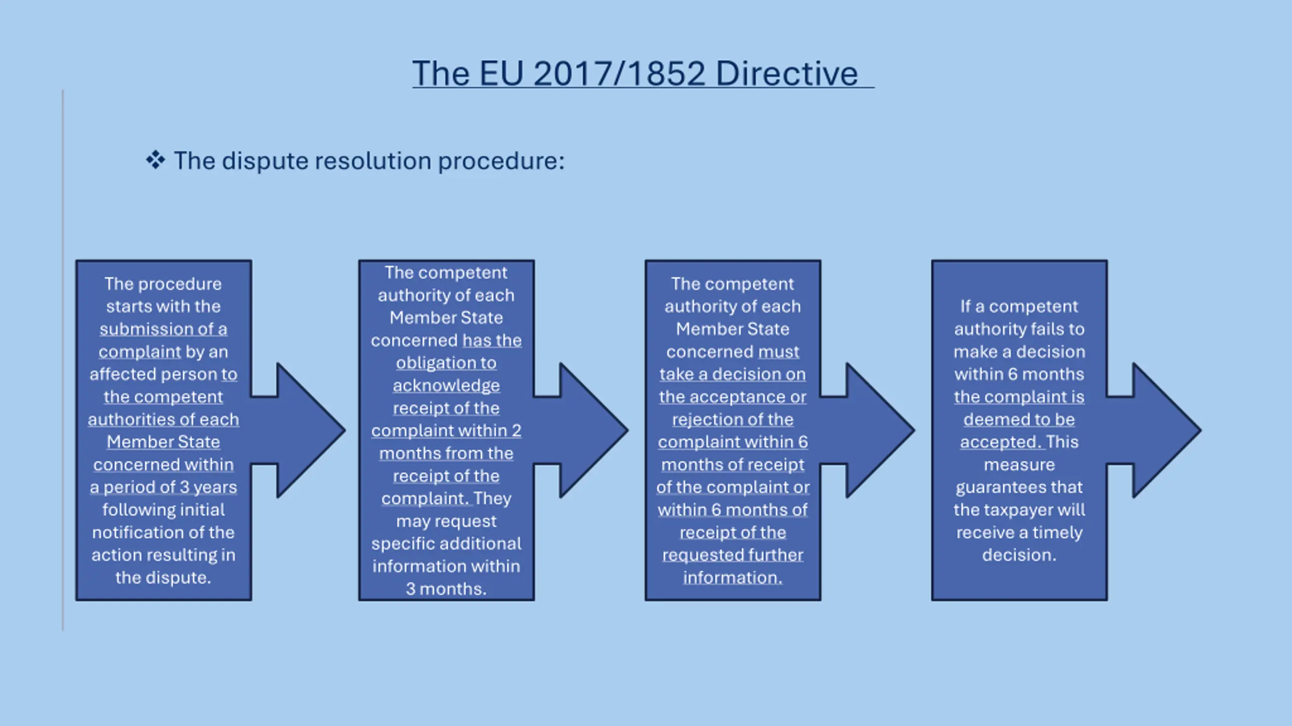 The EU 2017/1852 Directive The dispute resolution procedure: The competent authority of each Member State concerned has the obligation to acknowledge receipt of the complaint within 2 months from the receipt of the complaint. They may request specific additional information within 3 months. The procedure starts with the submission of a complaint by an affected person to the competent authorities of each Member State concerned within a period of 3 years following initial notification of the action resulting in the dispute. The competent authority of each Member State concerned must take a decision on the acceptance or rejection of the complaint within 6 months of receipt of the complaint or within 6 months of receipt of the requested further information. If a competent authority fails to make a decision within 6 months the complaint is deemed to be accepted. This measure guarantees that the taxpayer will receive a timely decision.