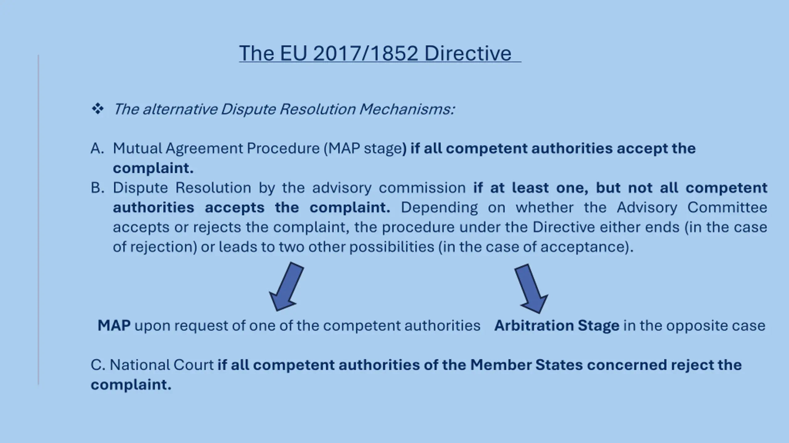 The EU 2017/1852 Directive The alternative Dispute Resolution Mechanisms: A. Mutual Agreement Procedure (MAP stage) if all competent authorities accept the complaint. B. Dispute Resolution by the advisory commission if at least one, but not all competent authorities accepts the complaint. Depending on whether the Advisory Committee accepts or rejects the complaint, the procedure under the Directive either ends (in the case of rejection) or leads to two other possibilities (in the case of acceptance). MAP upon request of one of the competent authorities Arbitration Stage in the opposite case C. National Court if all competent authorities of the Member States concerned reject the complaint.