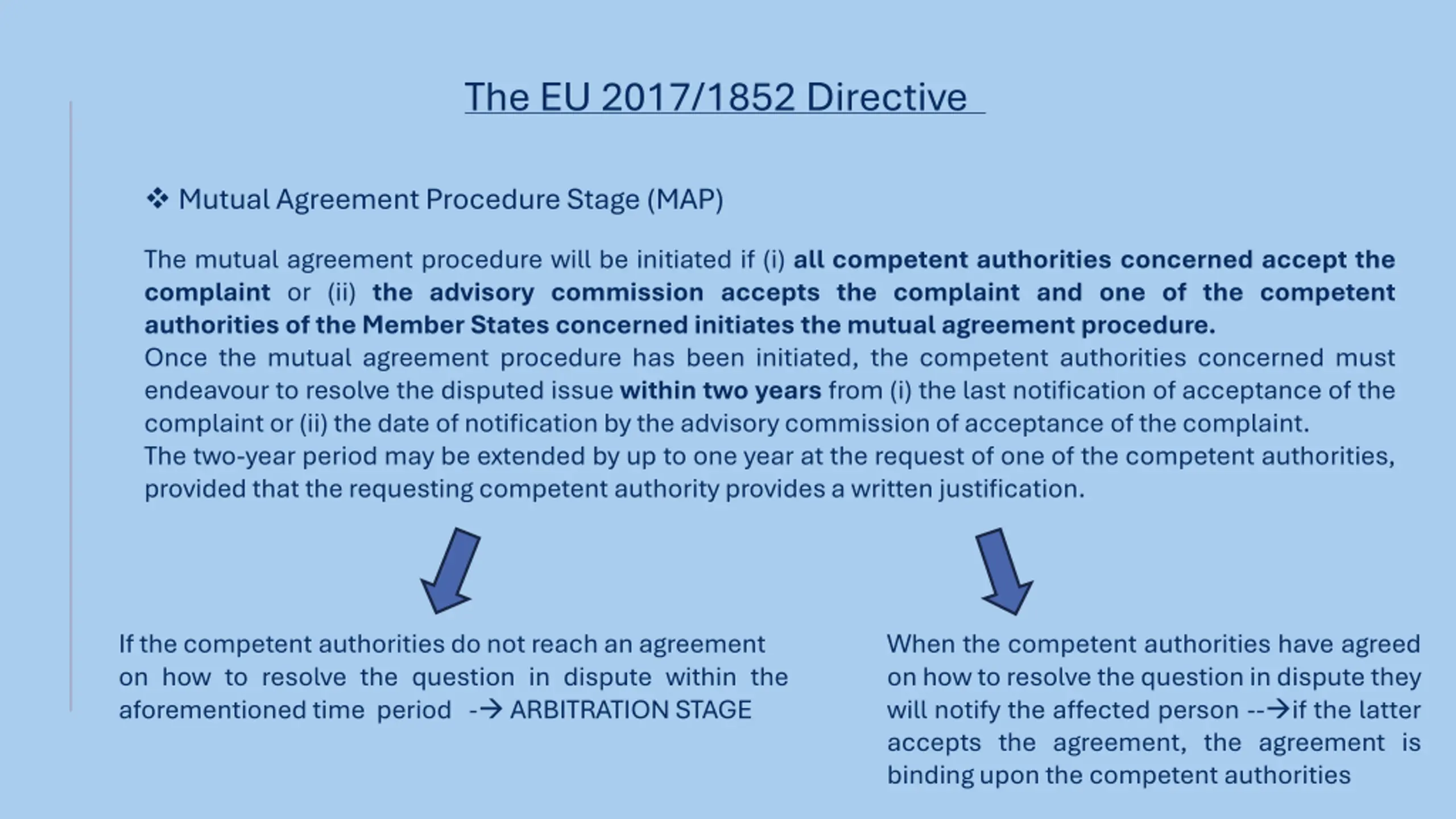 The EU 2017/1852 Directive Mutual Agreement Procedure Stage (MAP) The mutual agreement procedure will be initiated if (i) all competent authorities concerned accept the complaint or (ii) the advisory commission accepts the complaint and one of the competent authorities of the Member States concerned initiates the mutual agreement procedure. Once the mutual agreement procedure has been initiated, the competent authorities concerned must endeavour to resolve the disputed issue within two years from (i) the last notification of acceptance of the complaint or (ii) the date of notification by the advisory commission of acceptance of the complaint. The two-year period may be extended by up to one year at the request of one of the competent authorities, provided that the requesting competent authority provides a written justification. If the competent authorities do not reach an agreement on how to resolve the question in dispute within the aforementioned time period - ARBITRATION STAGE When the competent authorities have agreed on how to resolve the question in dispute they will notify the affected person -- if the latter accepts the agreement, the agreement is binding upon the competent authorities