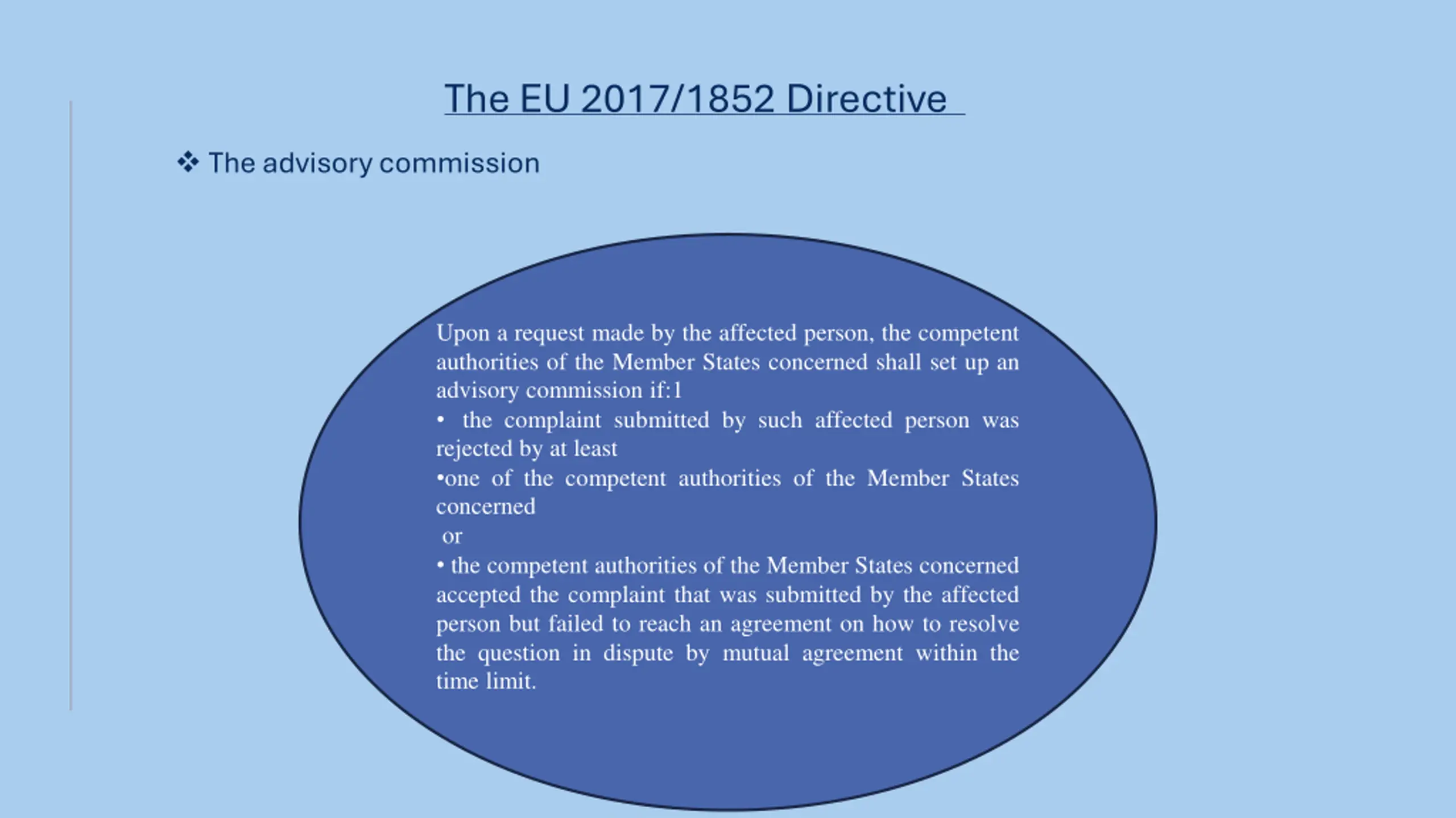 The EU 2017/1852 Directive The advisory commission Upon a request made by the affected person, the competent authorities of the Member States concerned shall set up an advisory commission if:1 the complaint submitted by such affected person was rejected by at least one of the competent authorities of the Member States concerned or the competent authorities of the Member States concerned accepted the complaint that was submitted by the affected person but failed to reach an agreement on how to resolve the question in dispute by mutual agreement within the time limit.