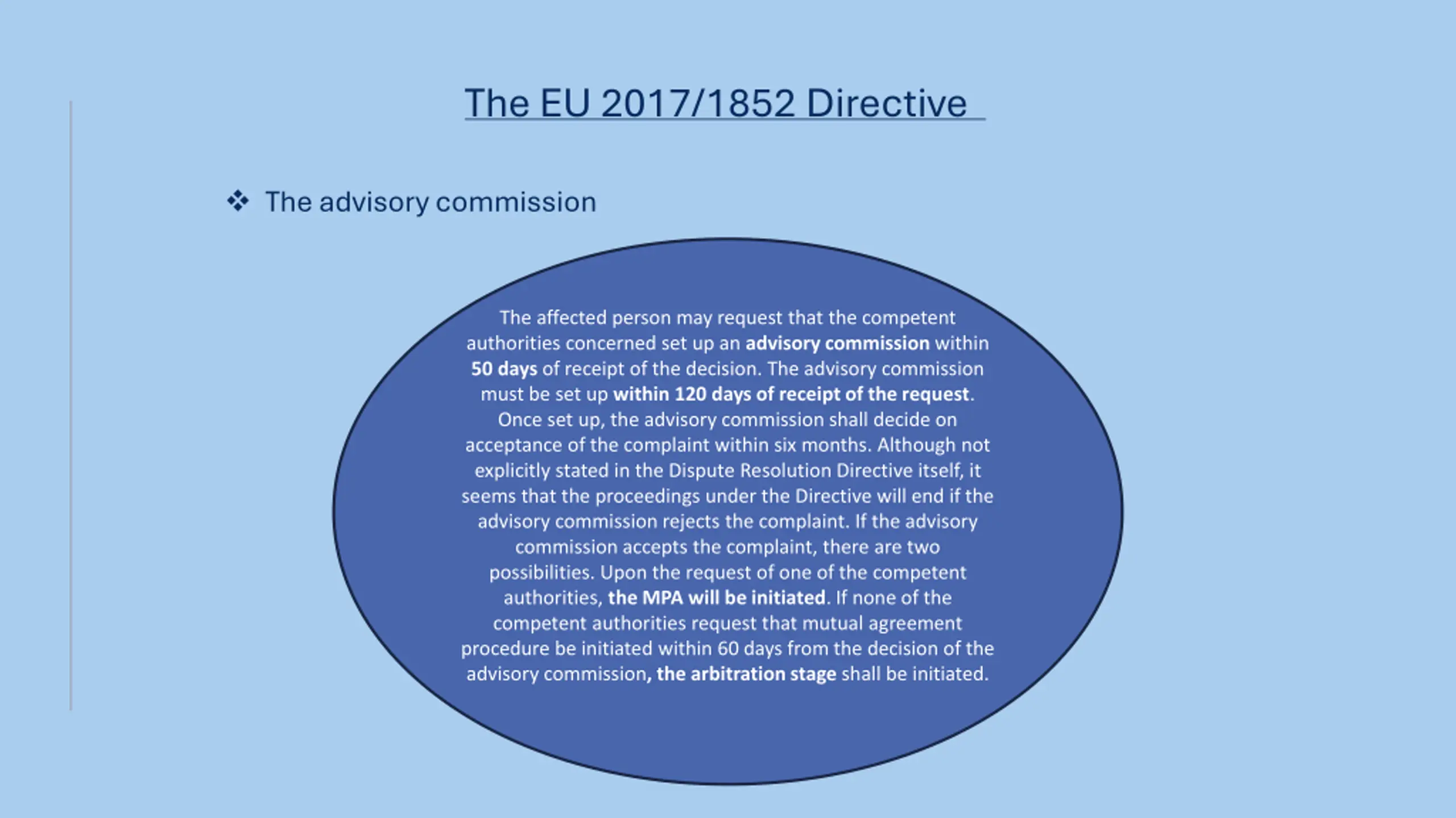 The EU 2017/1852 Directive The advisory commission The affected person may request that the competent authorities concerned set up an advisory commission within 50 days of receipt of the decision. The advisory commission must be set up within 120 days of receipt of the request. Once set up, the advisory commission shall decide on acceptance of the complaint within six months. Although not explicitly stated in the Dispute Resolution Directive itself, it seems that the proceedings under the Directive will end if the advisory commission rejects the complaint. If the advisory commission accepts the complaint, there are two possibilities. Upon the request of one of the competent authorities, the MPA will be initiated. If none of the competent authorities request that mutual agreement procedure be initiated within 60 days from the decision of the advisory commission, the arbitration stage shall be initiated.