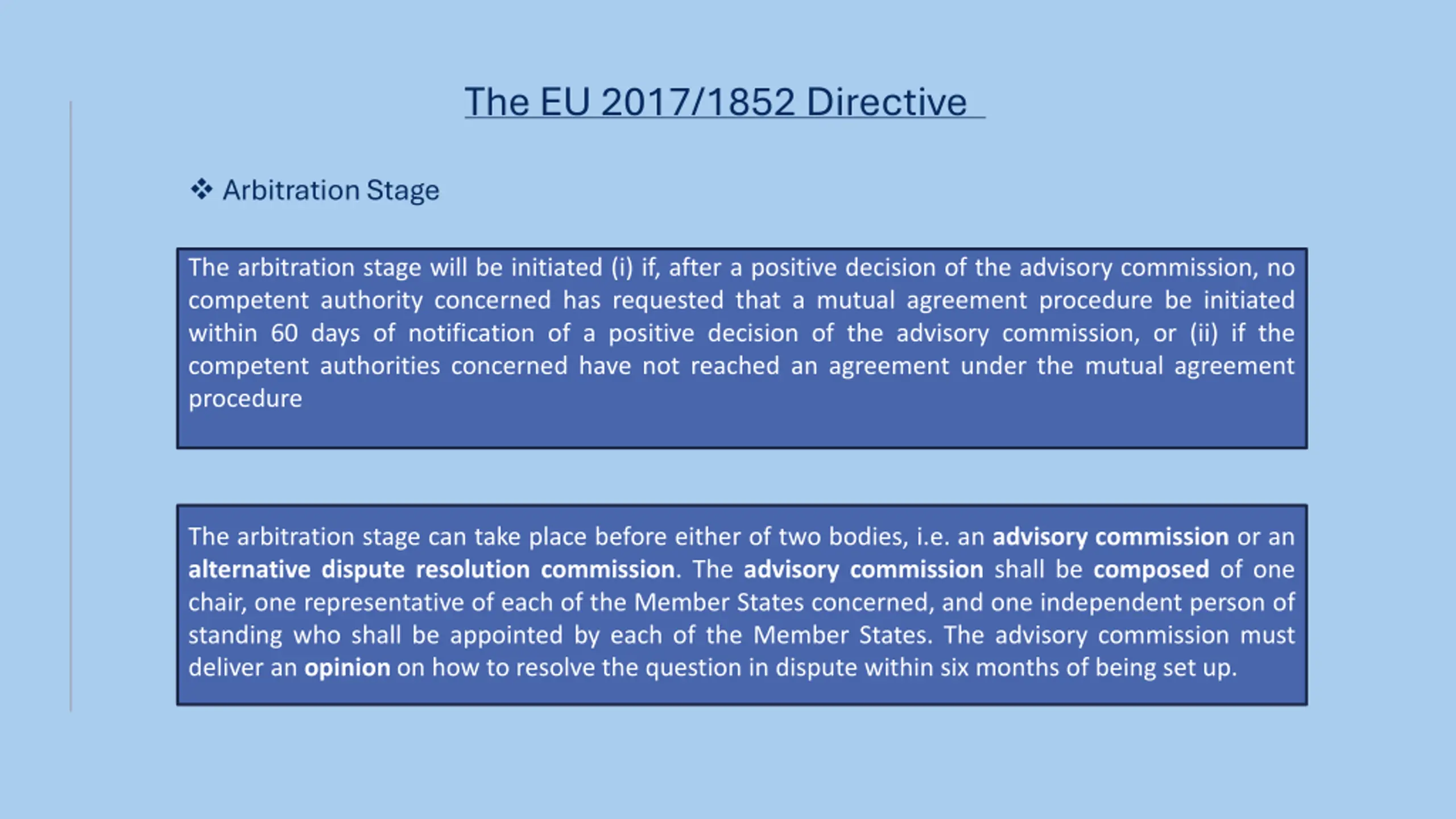 The EU 2017/1852 Directive Arbitration Stage The arbitration stage will be initiated (i) if, after a positive decision of the advisory commission, no competent authority concerned has requested that a mutual agreement procedure be initiated within 60 days of notification of a positive decision of the advisory commission, or (ii) if the competent authorities concerned have not reached an agreement under the mutual agreement procedure The arbitration stage can take place before either of two bodies, i.e. an advisory commission or an alternative dispute resolution commission. The advisory commission shall be composed of one chair, one representative of each of the Member States concerned, and one independent person of standing who shall be appointed by each of the Member States. The advisory commission must deliver an opinion on how to resolve the question in dispute within six months of being set up.