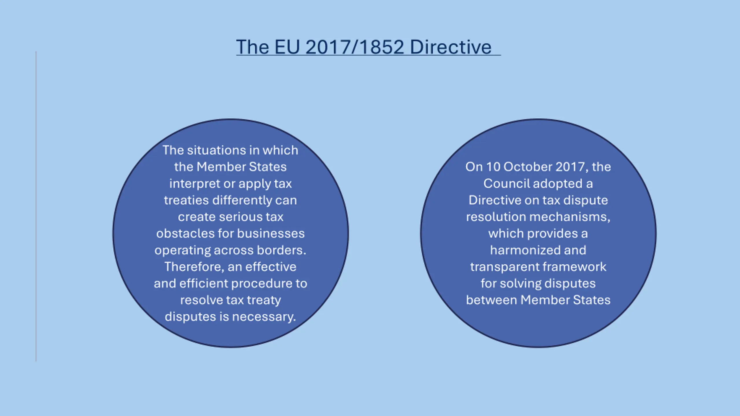 The EU 2017/1852 Directive The situations in which the Member States interpret or apply tax treaties differently can create serious tax obstacles for businesses operating across borders. Therefore, an effective and efficient procedure to resolve tax treaty disputes is necessary. On 10 October 2017, the Council adopted a Directive on tax dispute resolution mechanisms, which provides a harmonized and transparent framework for solving disputes between Member States