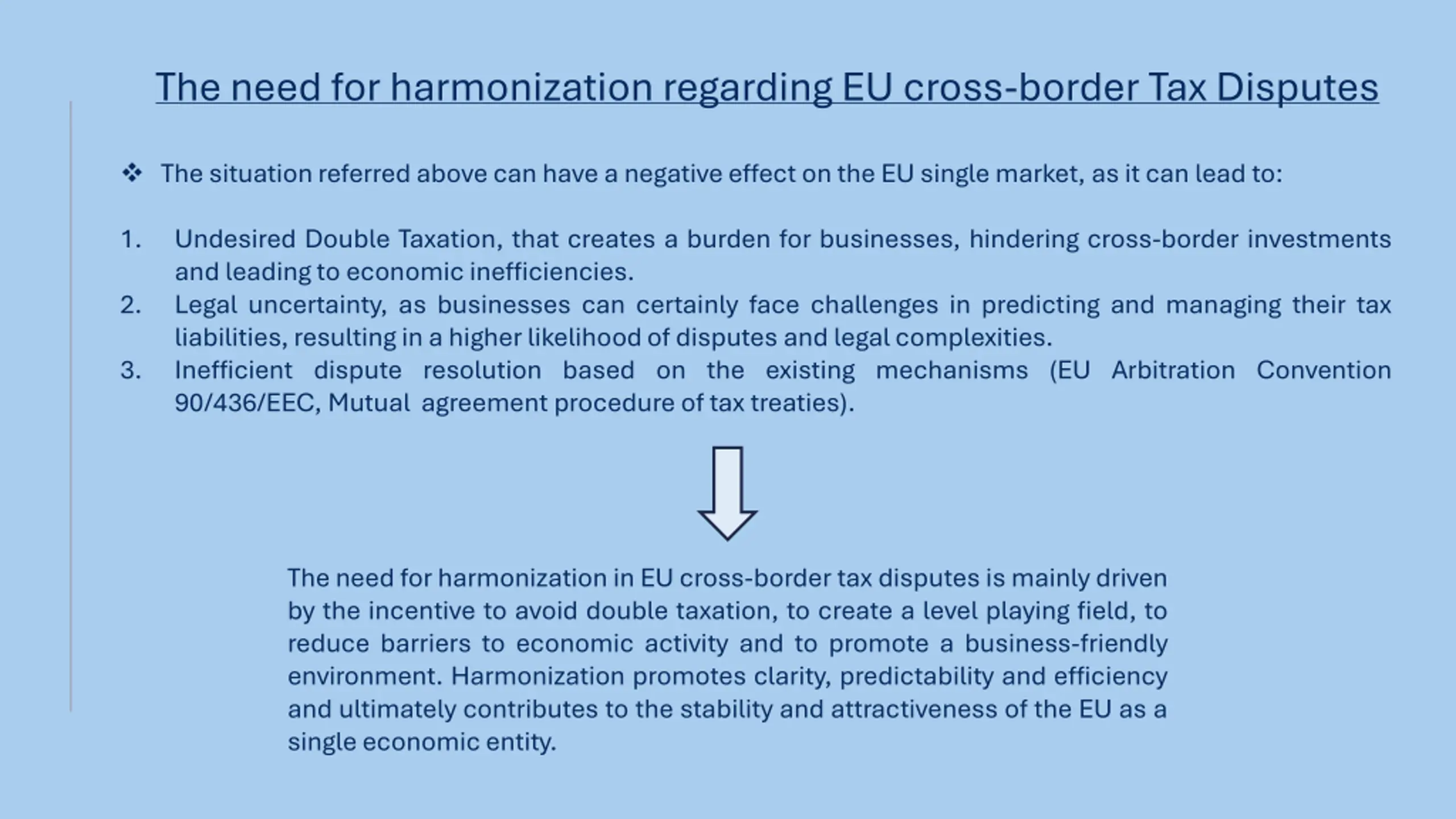 The need for harmonization regarding EU cross-border Tax Disputes The situation referred above can have a negative effect on the EU single market, as it can lead to: 1. Undesired Double Taxation, that creates a burden for businesses, hindering cross-border investments and leading to economic inefficiencies. Legal uncertainty, as businesses can certainly face challenges in predicting and managing their tax liabilities, resulting in a higher likelihood of disputes and legal complexities. Inefficient dispute resolution based on the existing mechanisms (EU Arbitration Convention 90/436/EEC, Mutual agreement procedure of tax treaties). 2. 3. The need for harmonization in EU cross-border tax disputes is mainly driven by the incentive to avoid double taxation, to create a level playing field, to reduce barriers to economic activity and to promote a business-friendly environment. Harmonization promotes clarity, predictability and efficiency and ultimately contributes to the stability and attractiveness of the EU as a single economic entity.