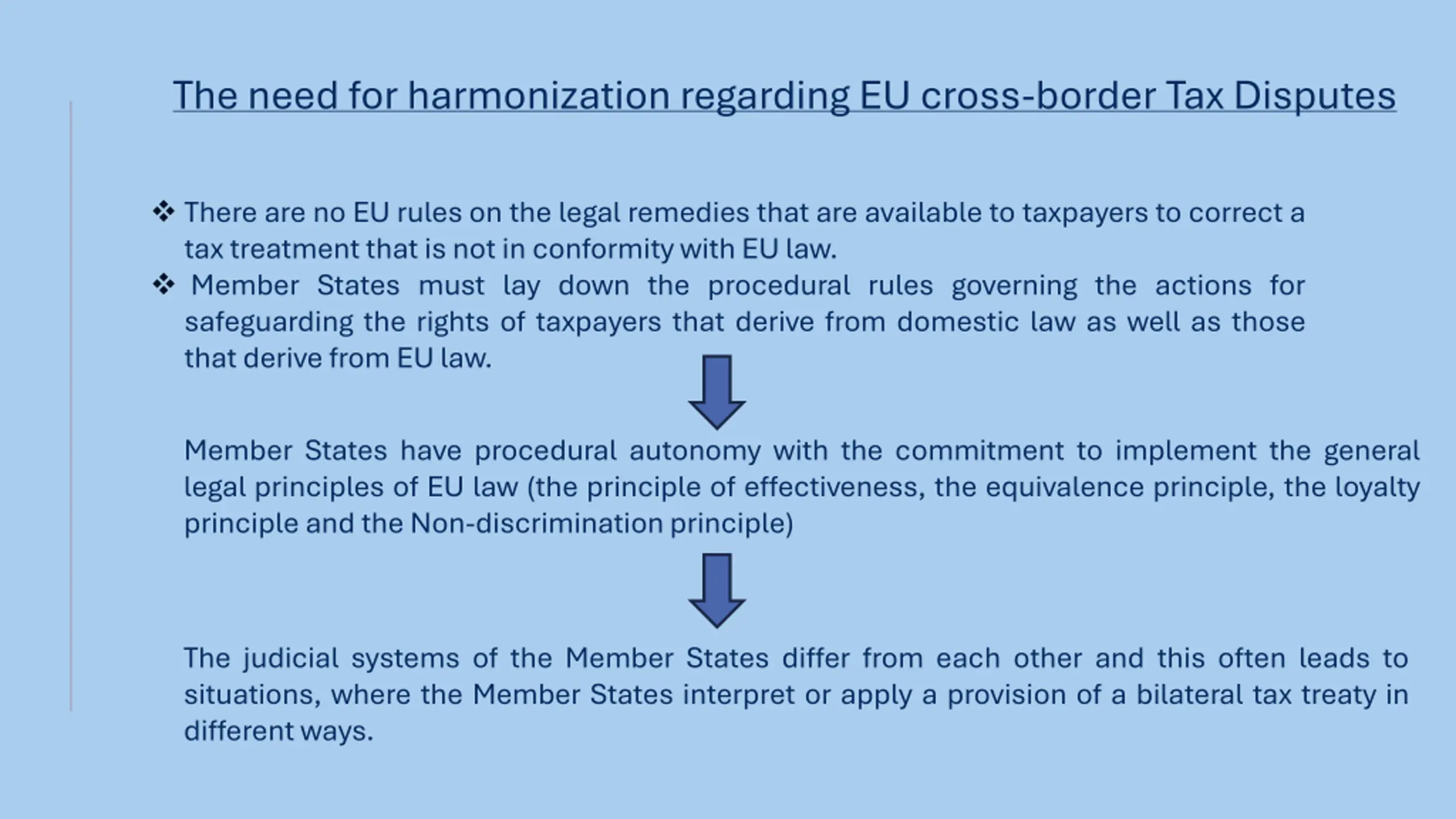 The need for harmonization regarding EU cross-border Tax Disputes There are no EU rules on the legal remedies that are available to taxpayers to correct a tax treatment that is not in conformity with EU law. Member States must lay down the procedural rules governing the actions for safeguarding the rights of taxpayers that derive from domestic law as well as those that derive from EU law. Member States have procedural autonomy with the commitment to implement the general legal principles of EU law (the principle of effectiveness, the equivalence principle, the loyalty principle and the Non-discrimination principle) The judicial systems of the Member States differ from each other and this often leads to situations, where the Member States interpret or apply a provision of a bilateral tax treaty in different ways.