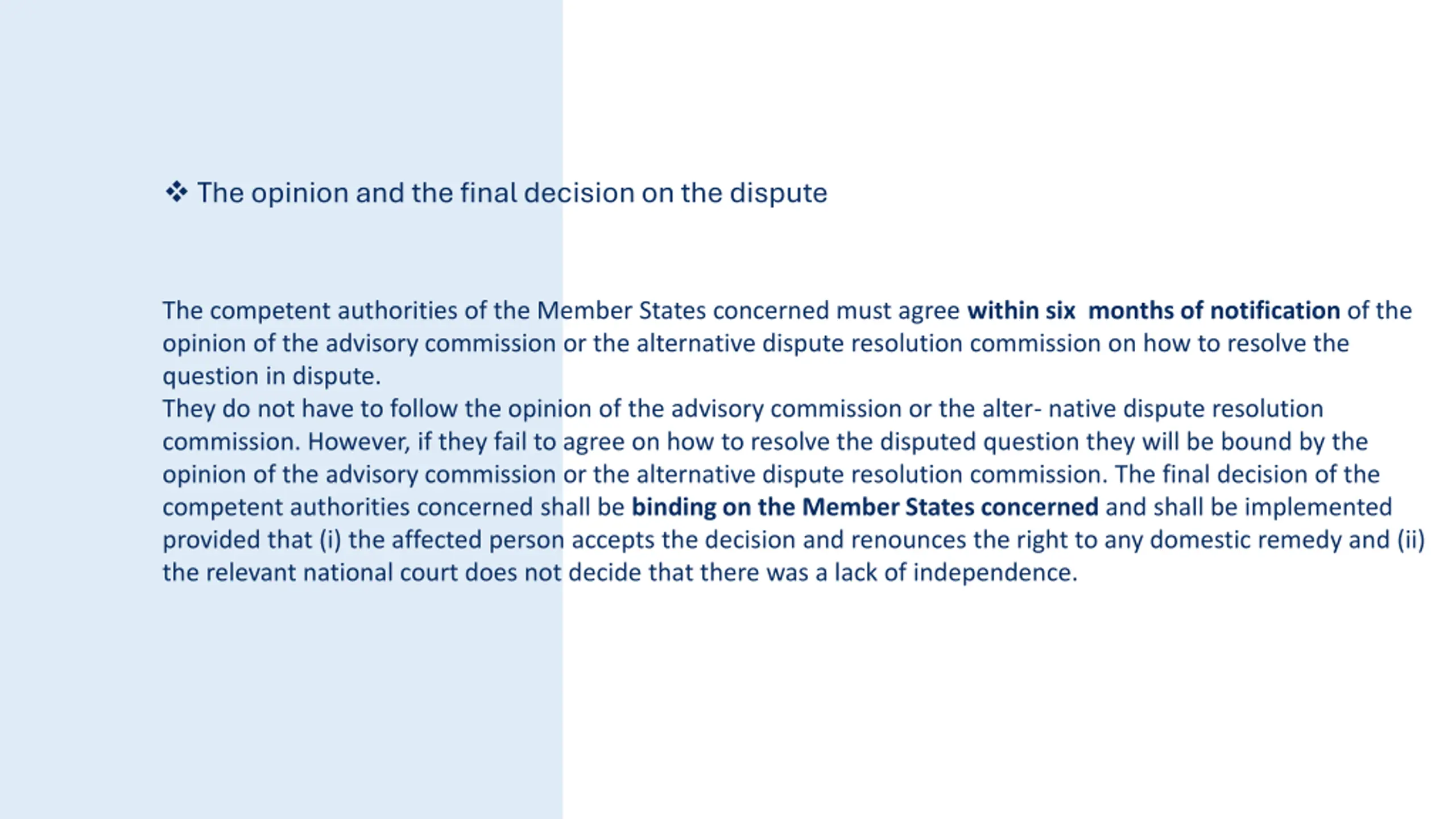 The opinion and the final decision on the dispute The competent authorities of the Member States concerned must agree within six months of notification of the opinion of the advisory commission or the alternative dispute resolution commission on how to resolve the question in dispute. They do not have to follow the opinion of the advisory commission or the alter- native dispute resolution commission. However, if they fail to agree on how to resolve the disputed question they will be bound by the opinion of the advisory commission or the alternative dispute resolution commission. The final decision of the competent authorities concerned shall be binding on the Member States concerned and shall be implemented provided that (i) the affected person accepts the decision and renounces the right to any domestic remedy and (ii) the relevant national court does not decide that there was a lack of independence.
