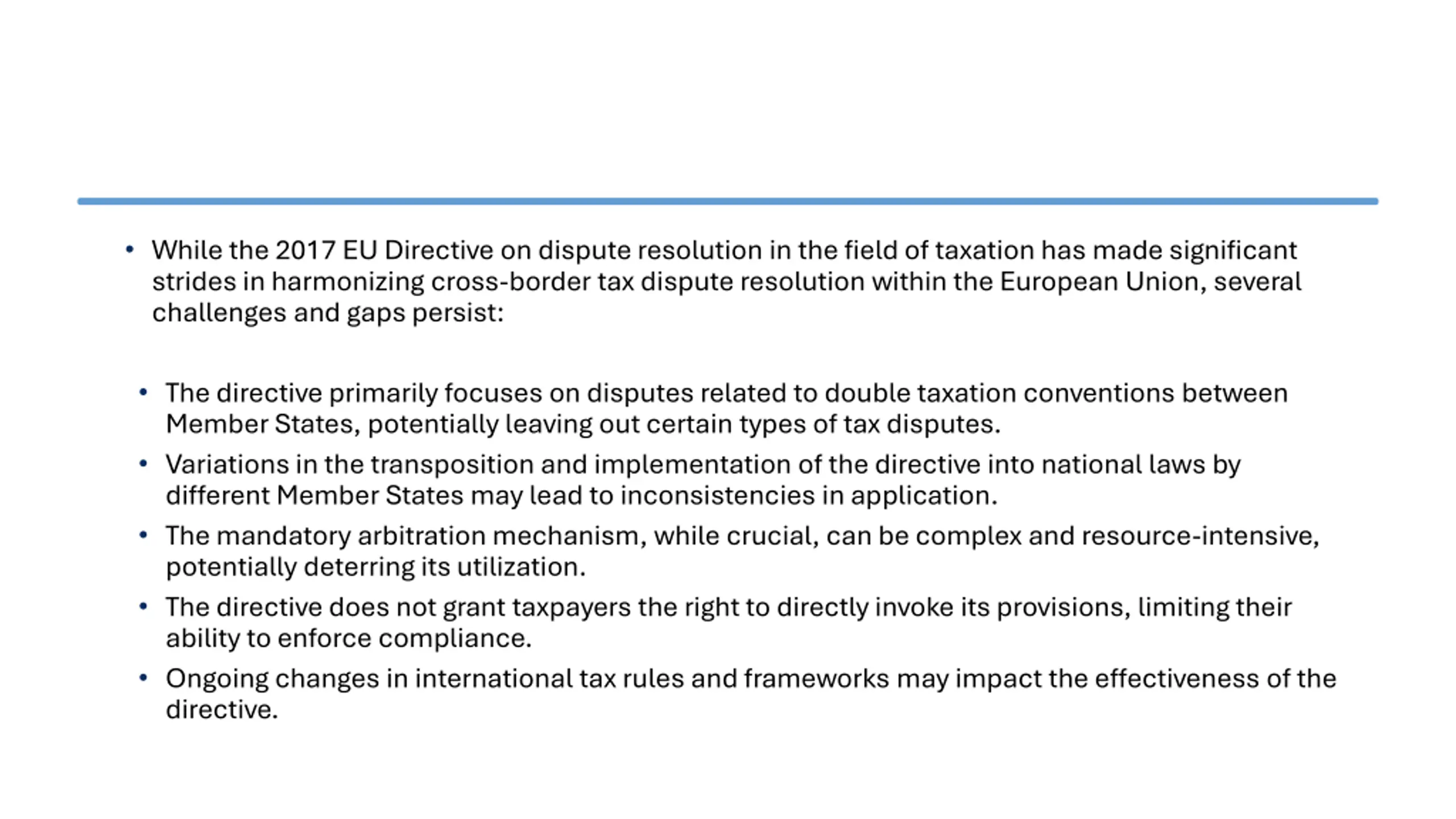 While the 2017 EU Directive on dispute resolution in the field of taxation has made significant strides in harmonizing cross-border tax dispute resolution within the European Union, several challenges and gaps persist: The directive primarily focuses on disputes related to double taxation conventions between Member States, potentially leaving out certain types of tax disputes. Variations in the transposition and implementation of the directive into national laws by different Member States may lead to inconsistencies in application. The mandatory arbitration mechanism, while crucial, can be complex and resource-intensive, potentially deterring its utilization. The directive does not grant taxpayers the right to directly invoke its provisions, limiting their ability to enforce compliance. Ongoing changes in international tax rules and frameworks may impact the effectiveness of the directive.