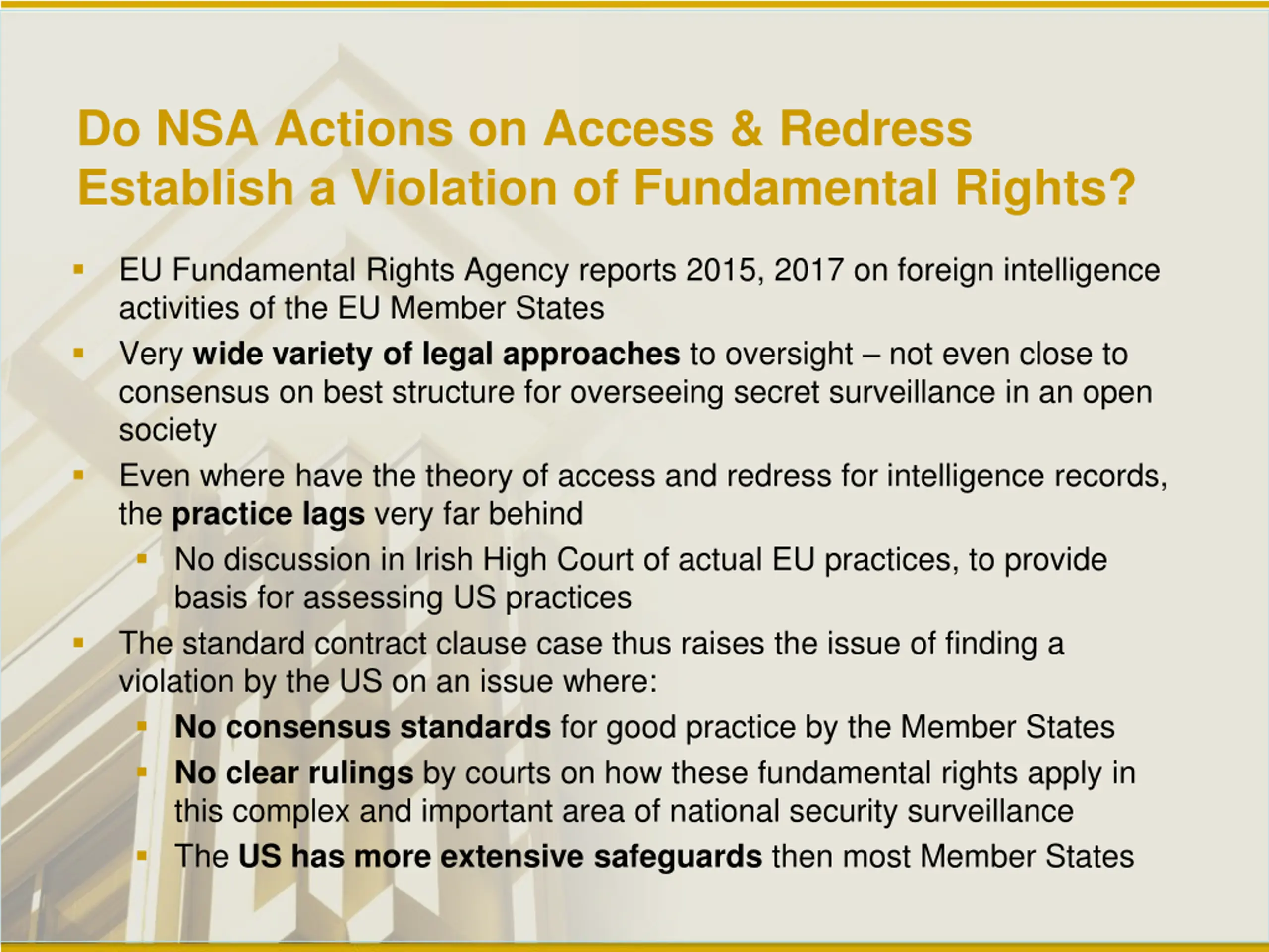 Do NSA Actions on Access & Redress Establish a Violation of Fundamental Rights? EU Fundamental Rights Agency reports 2015, 2017 on foreign intelligence activities of the EU Member States Very wide variety of legal approaches to oversight not even close to consensus on best structure for overseeing secret surveillance in an open society Even where have the theory of access and redress for intelligence records, the practice lags very far behind No discussion in Irish High Court of actual EU practices, to provide basis for assessing US practices The standard contract clause case thus raises the issue of finding a violation by the US on an issue where: No consensus standards for good practice by the Member States No clear rulings by courts on how these fundamental rights apply in this complex and important area of national security surveillance The US has more extensive safeguards then most Member States