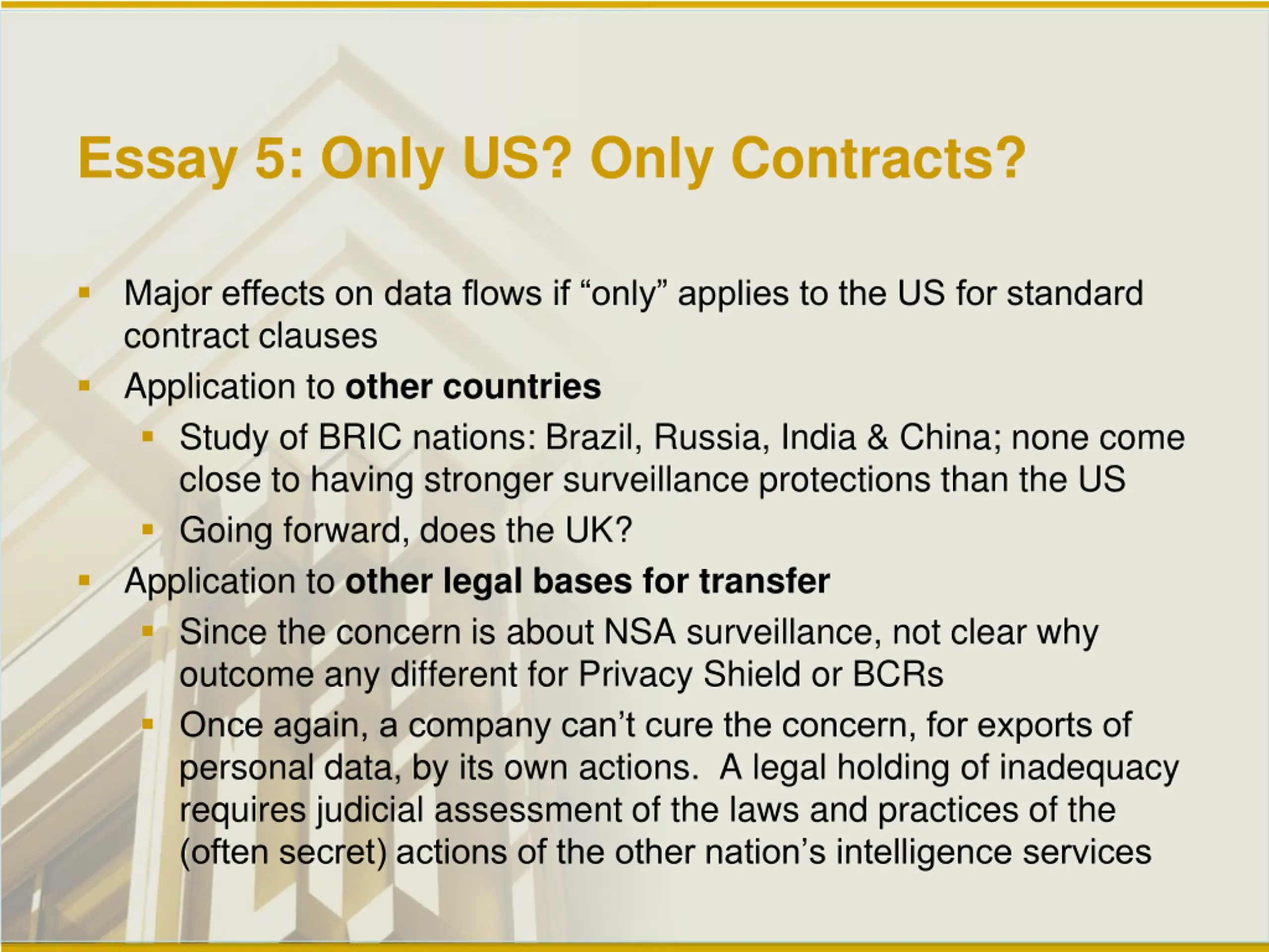 Essay 5: Only US? Only Contracts? Major effects on data flows if only applies to the US for standard contract clauses Application to other countries Study of BRIC nations: Brazil, Russia, India & China; none come close to having stronger surveillance protections than the US Going forward, does the UK? Application to other legal bases for transfer Since the concern is about NSA surveillance, not clear why outcome any different for Privacy Shield or BCRs Once again, a company can t cure the concern, for exports of personal data, by its own actions. A legal holding of inadequacy requires judicial assessment of the laws and practices of the (often secret) actions of the other nation s intelligence services