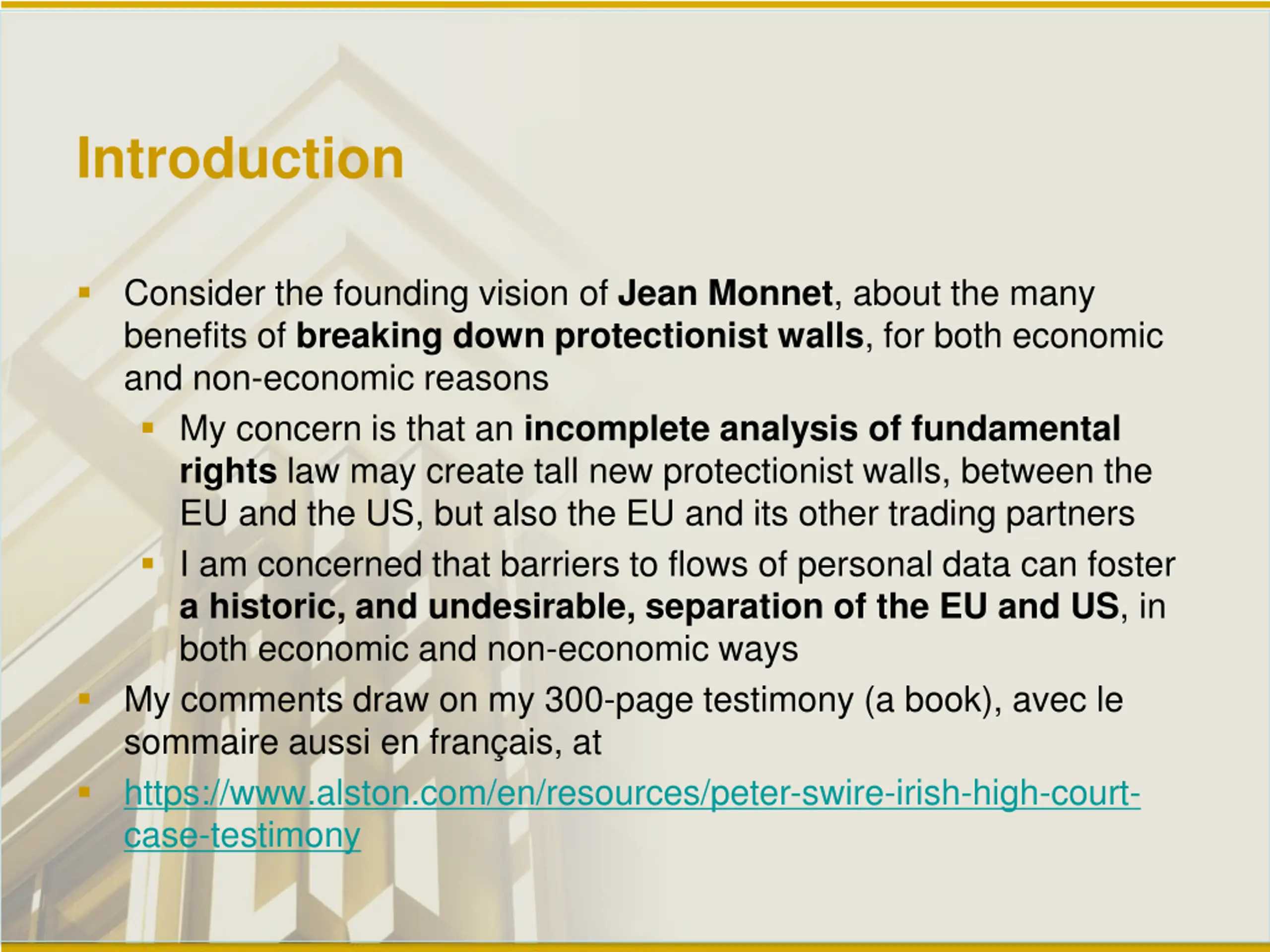 Introduction Consider the founding vision of Jean Monnet, about the many benefits of breaking down protectionist walls, for both economic and non-economic reasons My concern is that an incomplete analysis of fundamental rights law may create tall new protectionist walls, between the EU and the US, but also the EU and its other trading partners I am concerned that barriers to flows of personal data can foster a historic, and undesirable, separation of the EU and US, in both economic and non-economic ways My comments draw on my 300-page testimony (a book), avec le sommaire aussi en fran ais, at https://www.alston.com/en/resources/peter-swire-irish-high-court- case-testimony