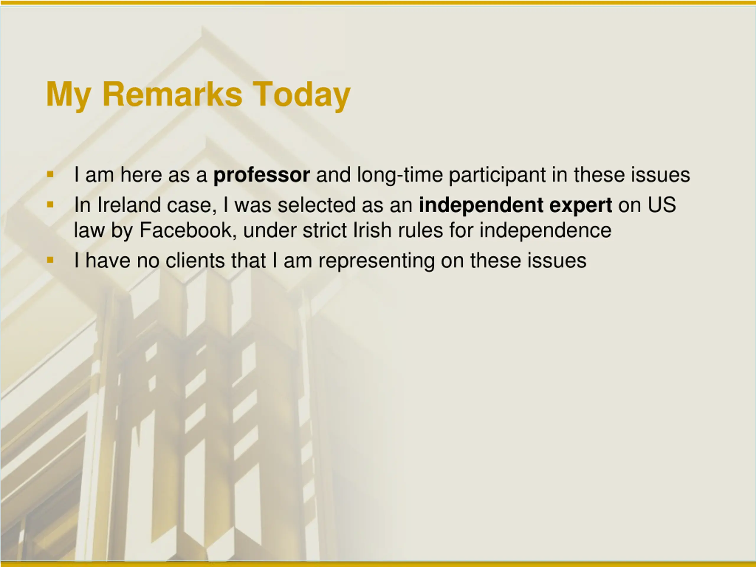 My Remarks Today I am here as a professor and long-time participant in these issues In Ireland case, I was selected as an independent expert on US law by Facebook, under strict Irish rules for independence I have no clients that I am representing on these issues
