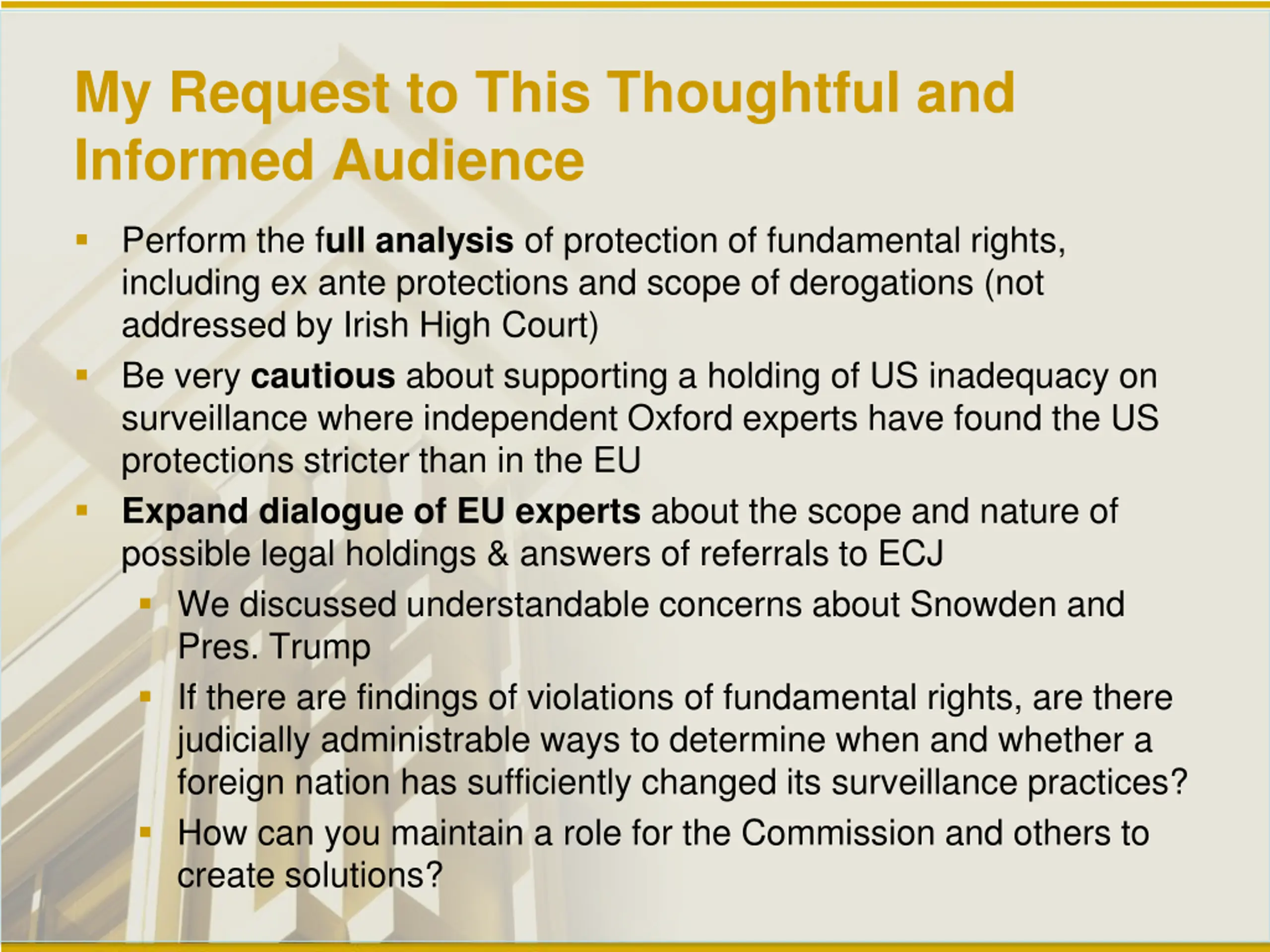 My Request to This Thoughtful and Informed Audience Perform the full analysis of protection of fundamental rights, including ex ante protections and scope of derogations (not addressed by Irish High Court) Be very cautious about supporting a holding of US inadequacy on surveillance where independent Oxford experts have found the US protections stricter than in the EU Expand dialogue of EU experts about the scope and nature of possible legal holdings & answers of referrals to ECJ We discussed understandable concerns about Snowden and Pres. Trump If there are findings of violations of fundamental rights, are there judicially administrable ways to determine when and whether a foreign nation has sufficiently changed its surveillance practices? How can you maintain a role for the Commission and others to create solutions?